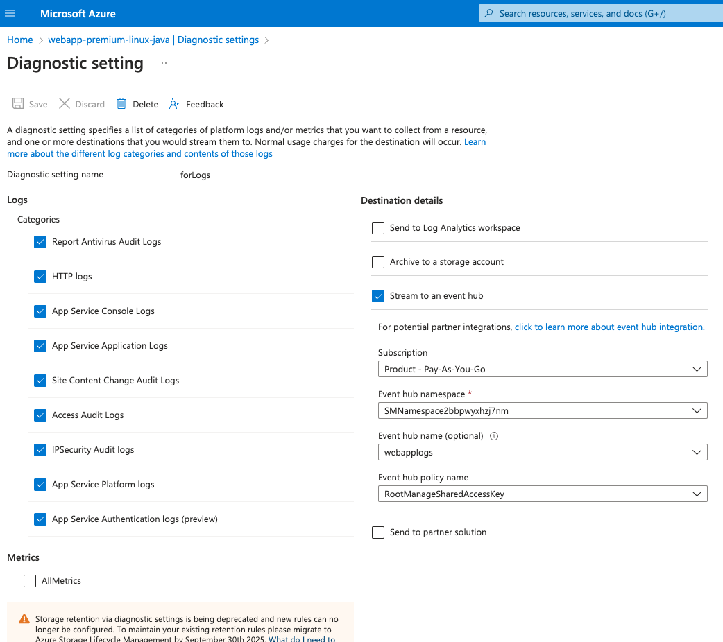 HTTP logs,App Service Console Logs,App Service Application Logs,Access Audit Logs,IPSecurity Audit logs,App Service Platform logs,Report Antivirus Audit Logs,Site Content Change Audit Logs. - Use the Event Hub namespace and Event Hub name configured in previous step in destination details section. You can use the default policy