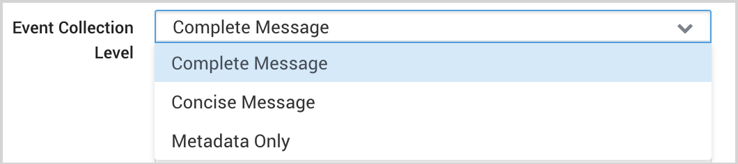 - Event Collection Level. When JSON format is selected you have to select Complete Message from the dropdown. Complete Message will ingest the entire event content, along with metadata.