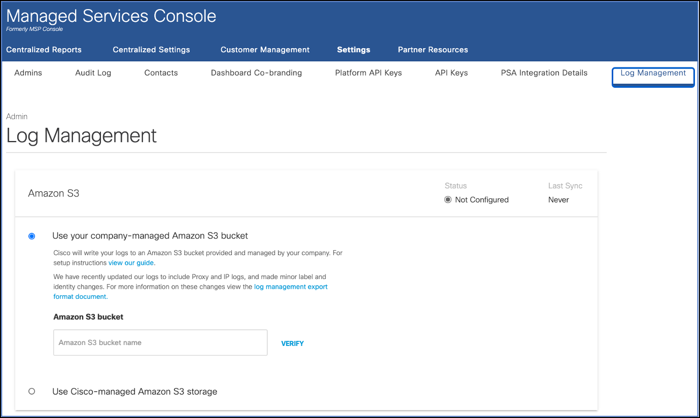 - A Cisco-managed bucket. Cisco Umbrella owns the bucket and sets the configuration and management of it. For more information, see Enable Logging to a Cisco-managed S3 Bucket.