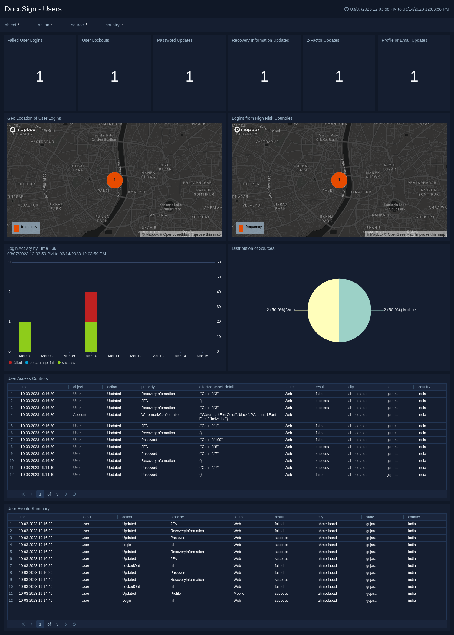 The DocuSign - Users dashboard gives you detailed information regarding the operations performed by the users of the organizations. It gives you the geo-locations of all the user logins and login activity from high-risk locations. Also, it gives visibility into user login activity and distribution of sources of user activity. Furthermore, it summarizes the critical updates in settings, roles, and permissions.