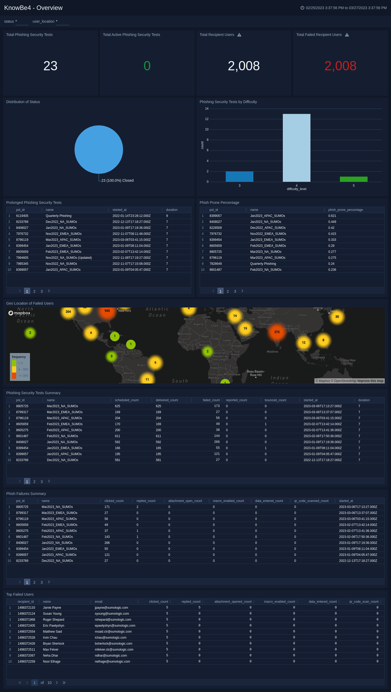 The KnowBe4 App for Sumo Logic allows you to easily integrate data from KnowBe4, a security awareness training and simulated phishing platform, into your Sumo Logic account. This App provides an overview of your organization's phishing security testing performance. It includes metrics on the total number of tests, active tests, recipient users, failed recipient users, and distribution of status.