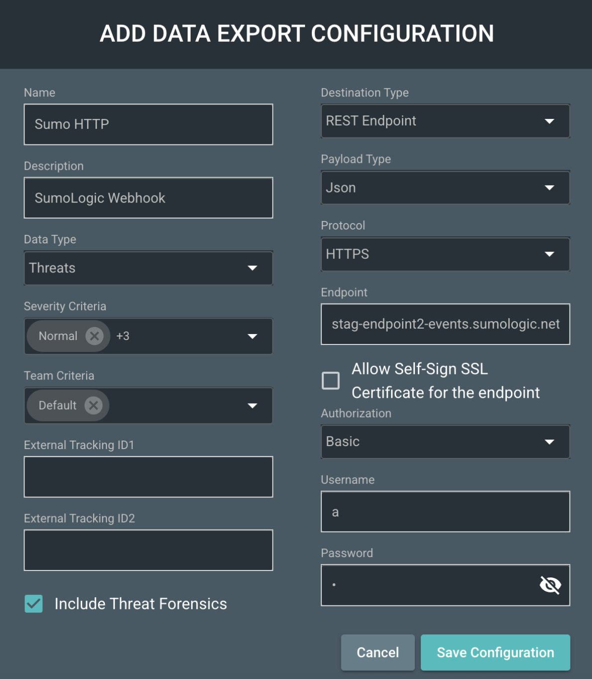 - Enter the required details as shown in the screenshot below, and use the Sumo Logic HTTP Source URL from step 1 as the Endpoint.