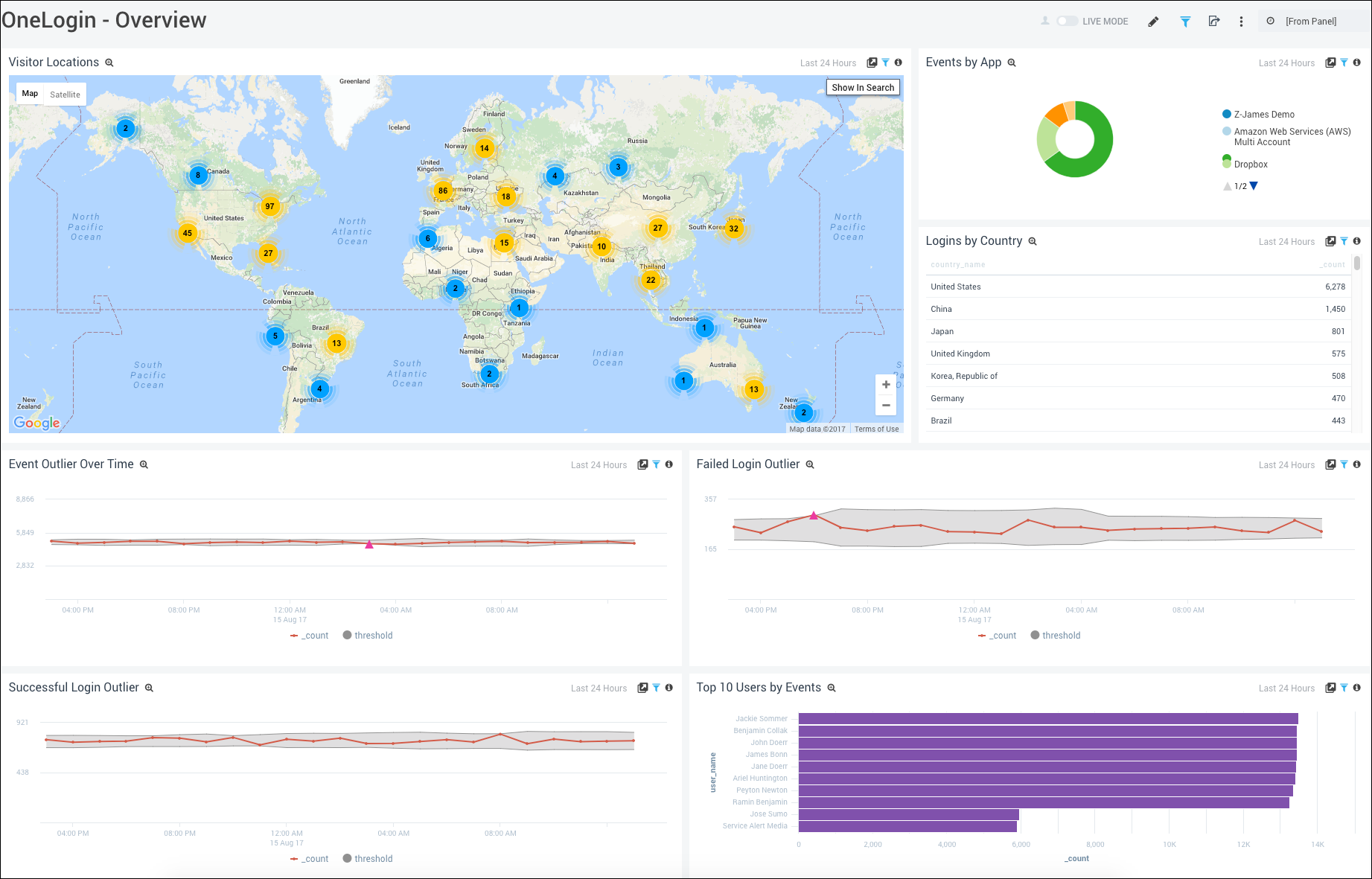 Logins by Country. View the count of the logins by country in the last 24 hours to identify any unusual activity by country.