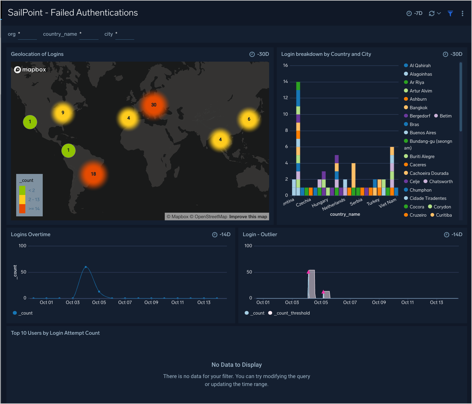 The SailPoint - Failed Authentications dashboard shows the details of failed logins such as the geolocation, country, state, failed login trends, outlier, and top 10 users.
