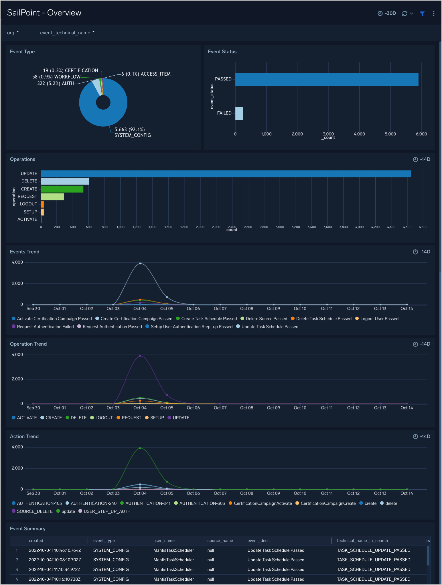 The SailPoint - Overview dashboard provides a summary of SailPoint events, actions, operations, event trend analysis, and a summary table for all user events.