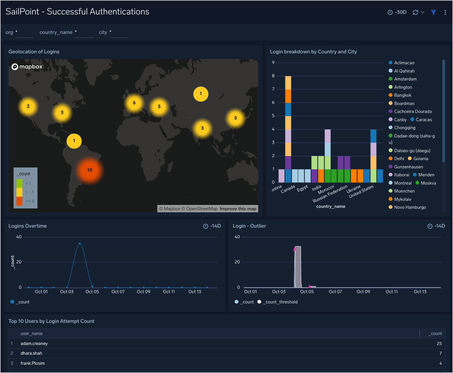 The SailPoint - Successful Authentications dashboard provides the details of success logins such as the geolocation, country, state, failed login trends, outlier, and top 10 users.