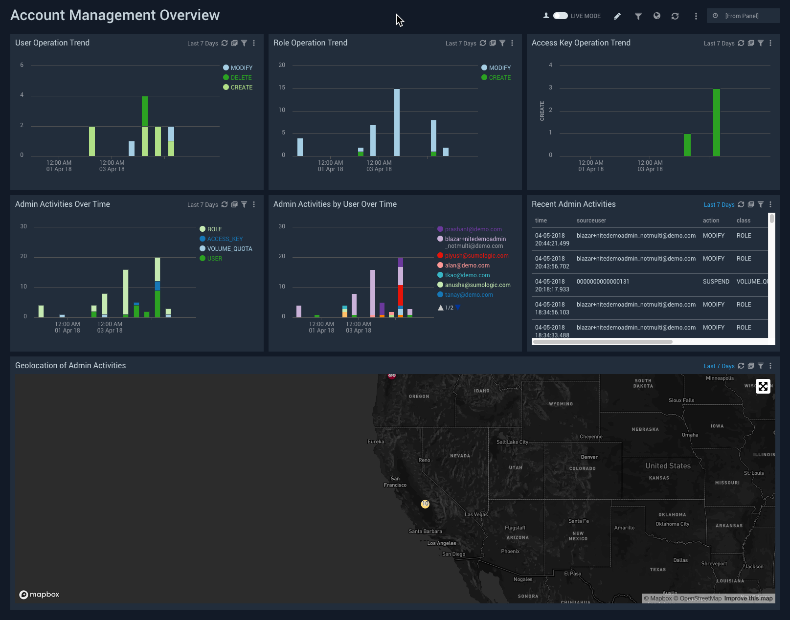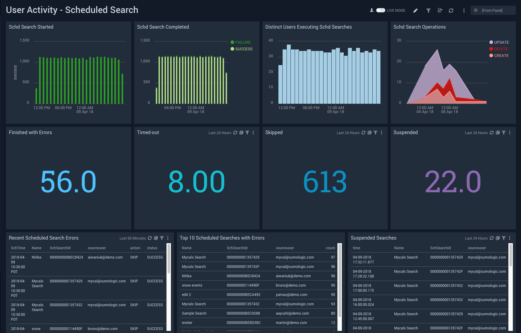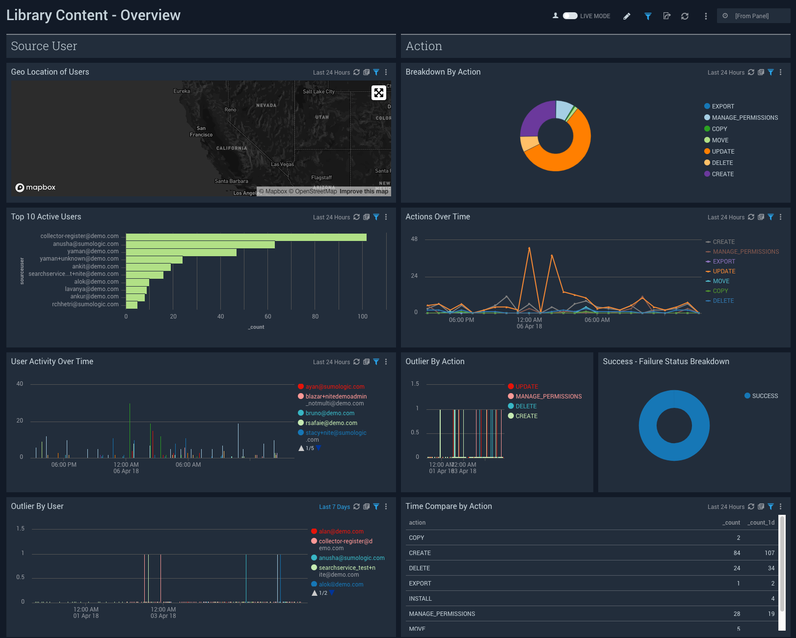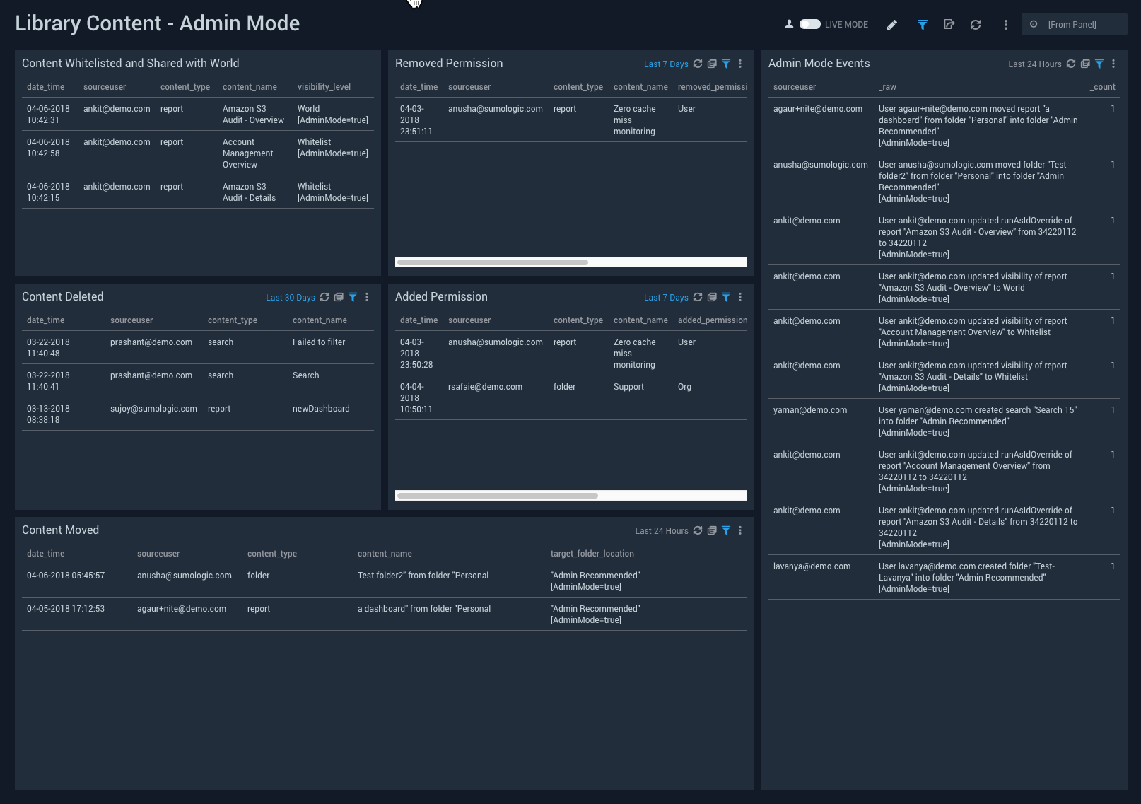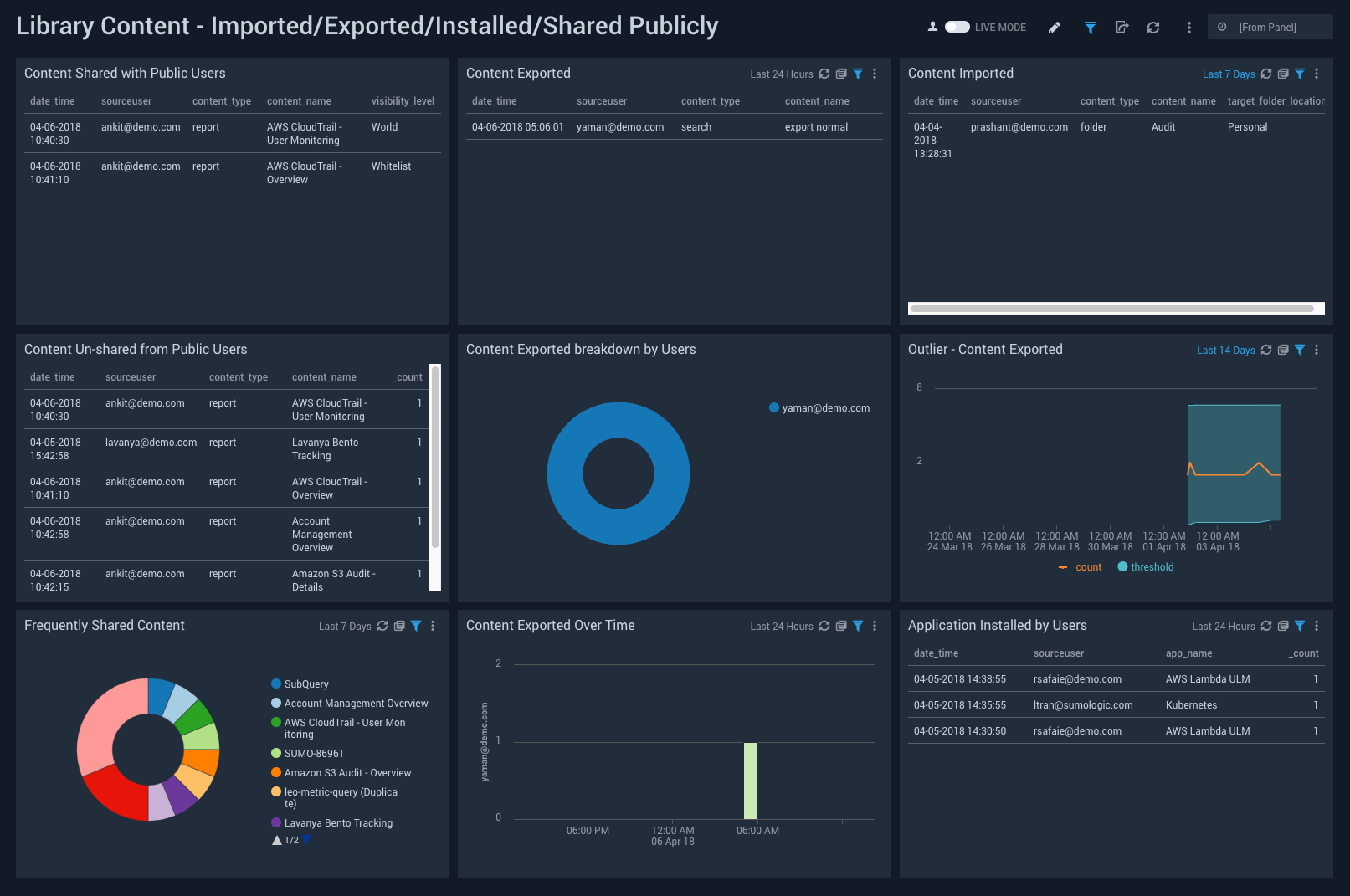 The Sumo Logic Audit app uses Sumo Logic audit index events to present information about account management activities, user activities, and management of Library content (searches, dashboards/reports, and folders) in your Sumo Logic account. The app uses predefined searches and Dashboards that provide visibility into your environment.