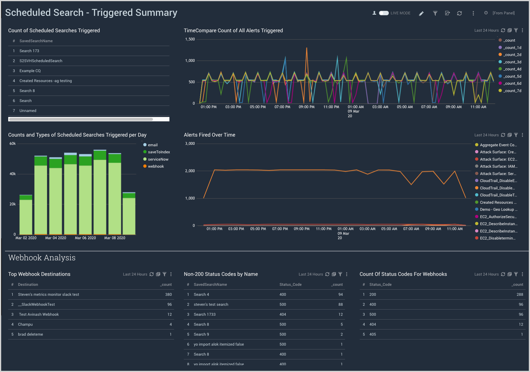 Count of Scheduled Searches Triggered. A listing of scheduled searches that have been triggered and their saved search names.