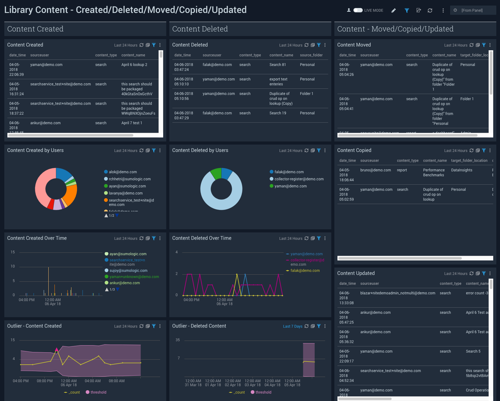 Content Created. Shows an aggregation table of library content created with columns for the time, user, type of content, name of content, and folder location, for the last 24 hours.