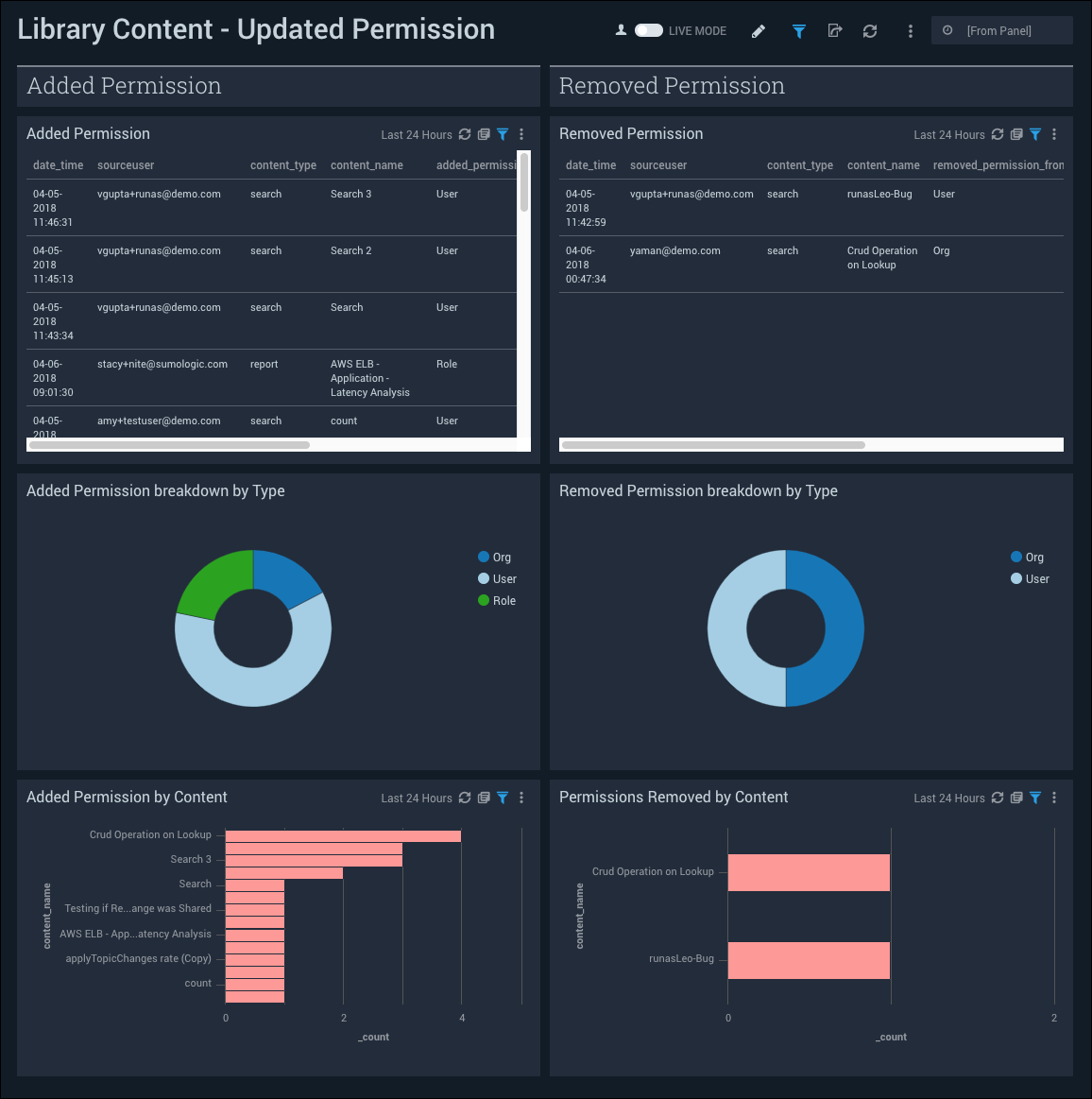 Added Permission by Content. Shows the number of users that were given permission to library content (searches, dashboards, folders) on a bar chart for the last 24 hours.