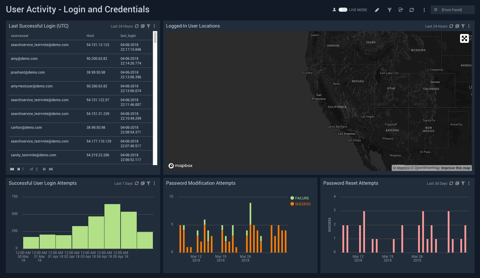 Last Successful Login (UTC). Displays an aggregation table of the last successful login per user, including the host and UTC event time for the last 24 hours.
