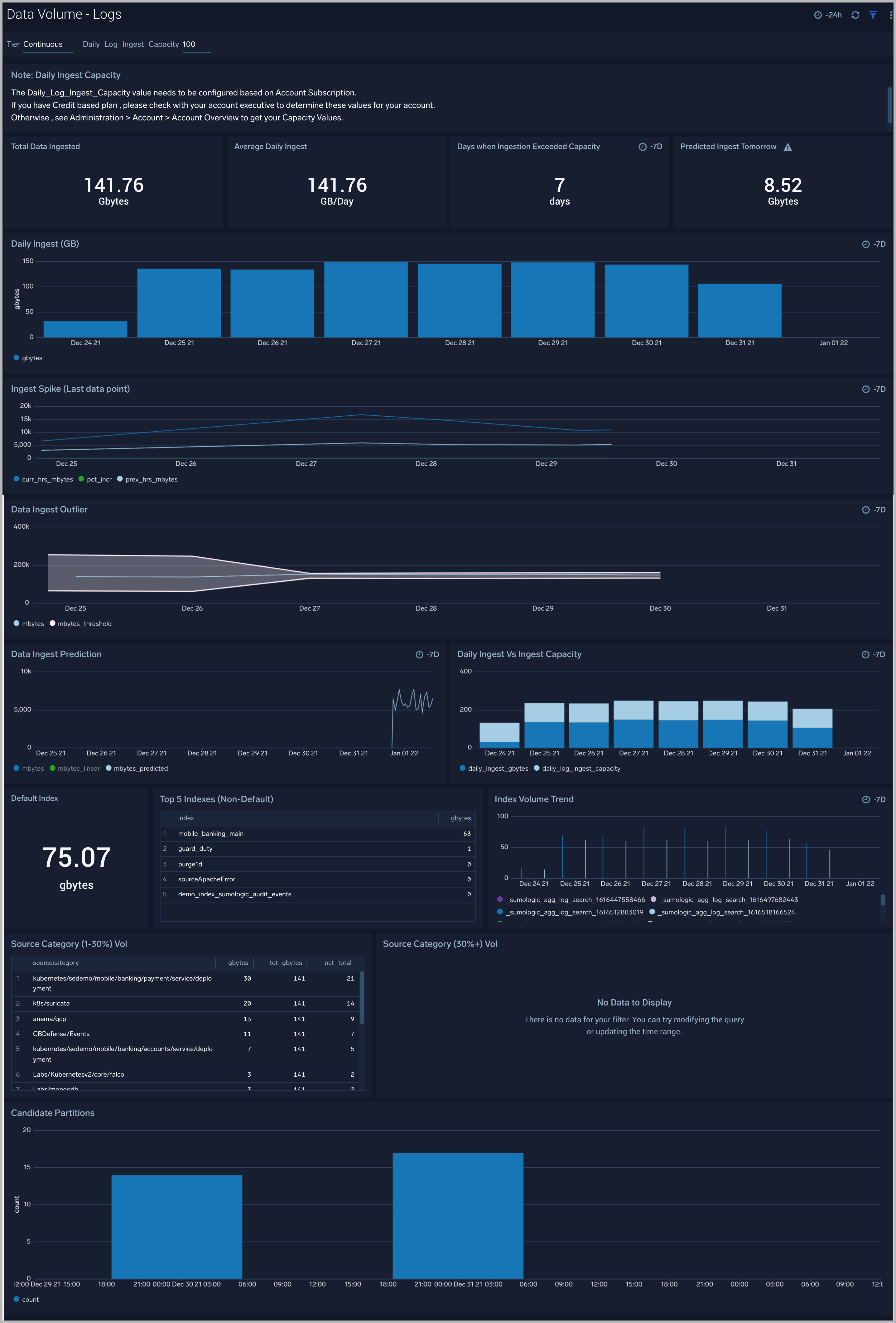 The largest data ingest typically comes from log volumes. The Data Volume - Logs dashboard allows you to view your log ingest volume by tier by ingesting spikes, outliers, and quota.