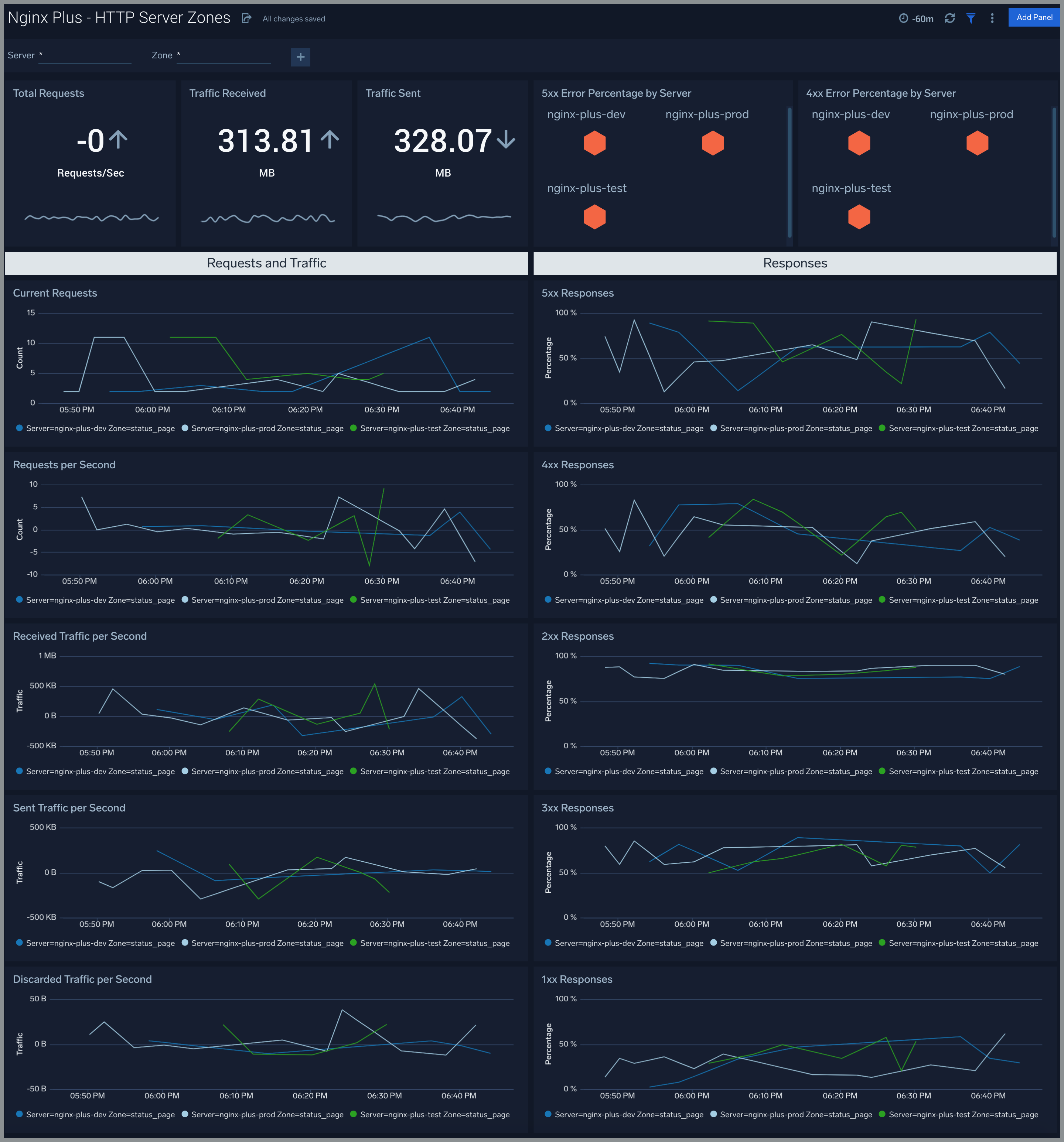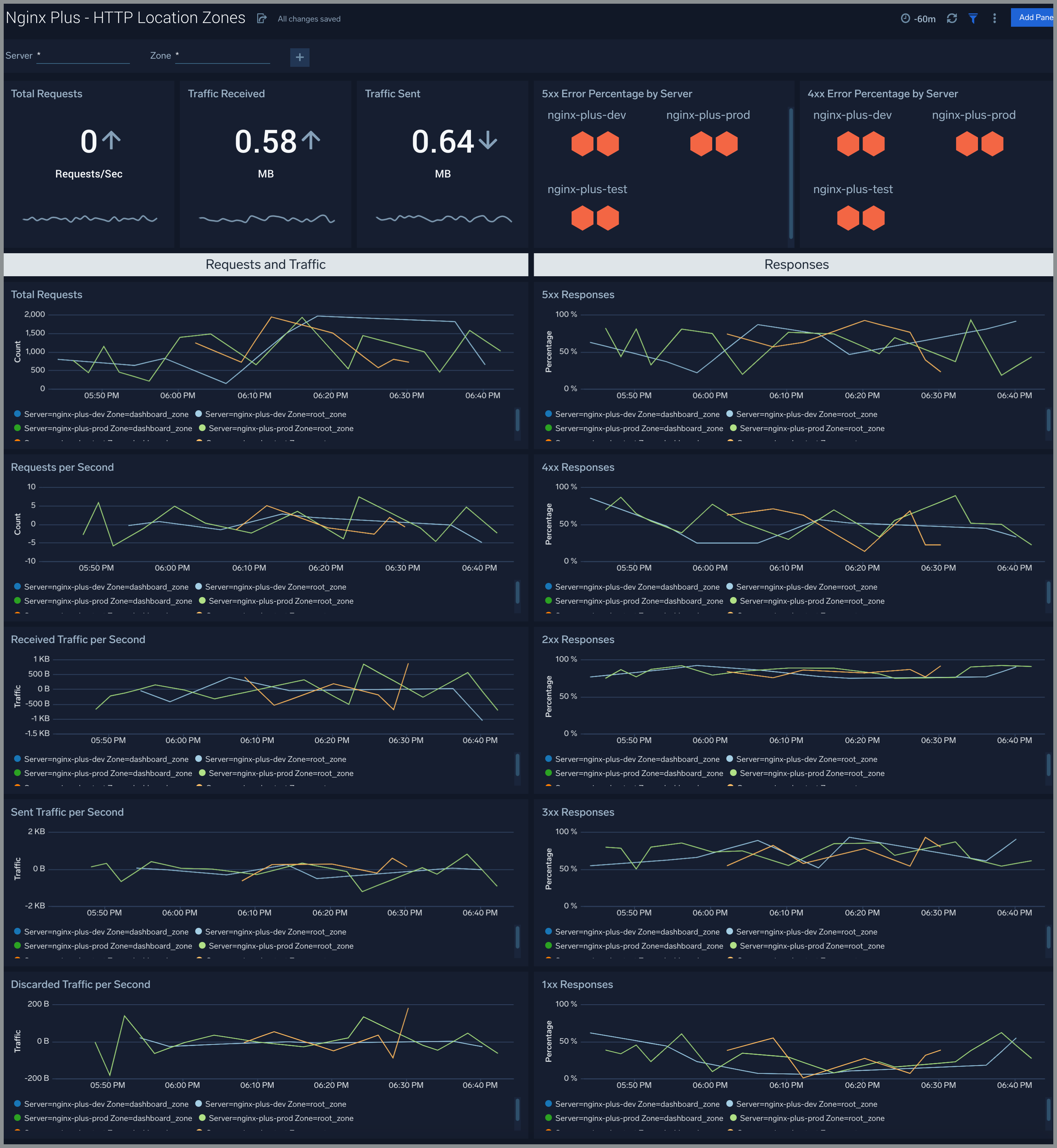 - Gain information about Server HTTP zones error responses: percentage of responses by server, percentage of each type of error response.
