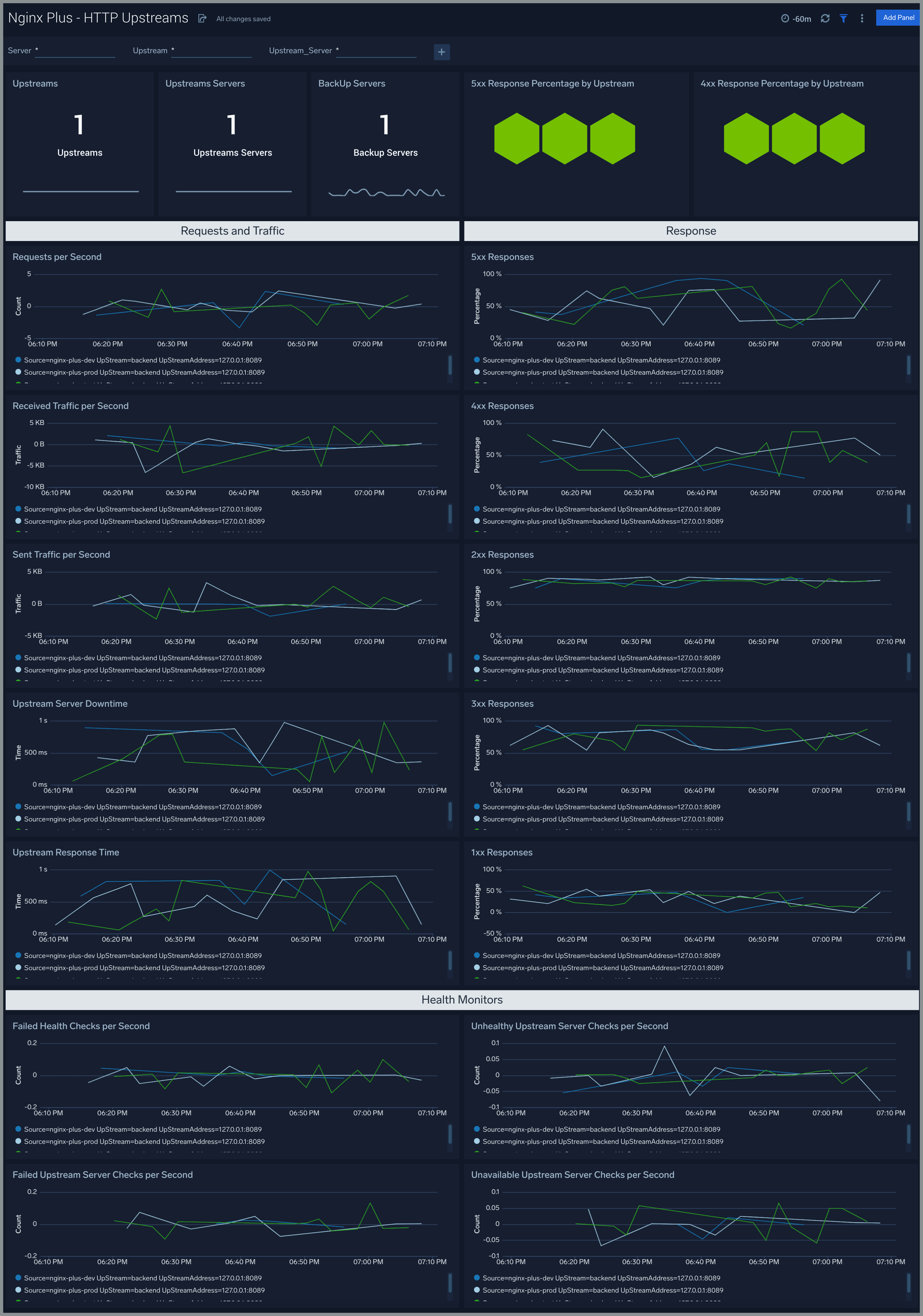 The Nginx Plus - HTTP Upstreams dashboard provides information about each upstream group for HTTP and HTTPS traffic, showing the number of HTTP upstreams, servers, backup servers, error responses, and health monitoring.