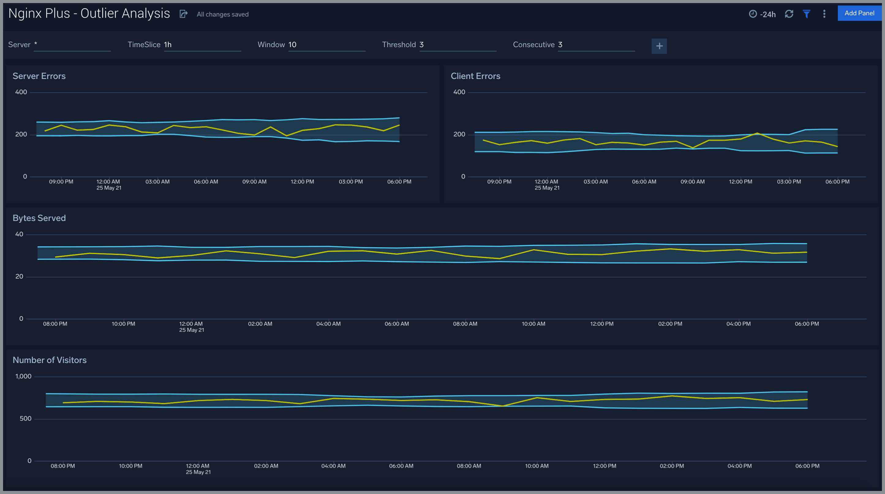 Each panel slowly fills with data matching the time range query received since the panel was created. Results will not immediately be available but will be updated with full graphs and charts over time.