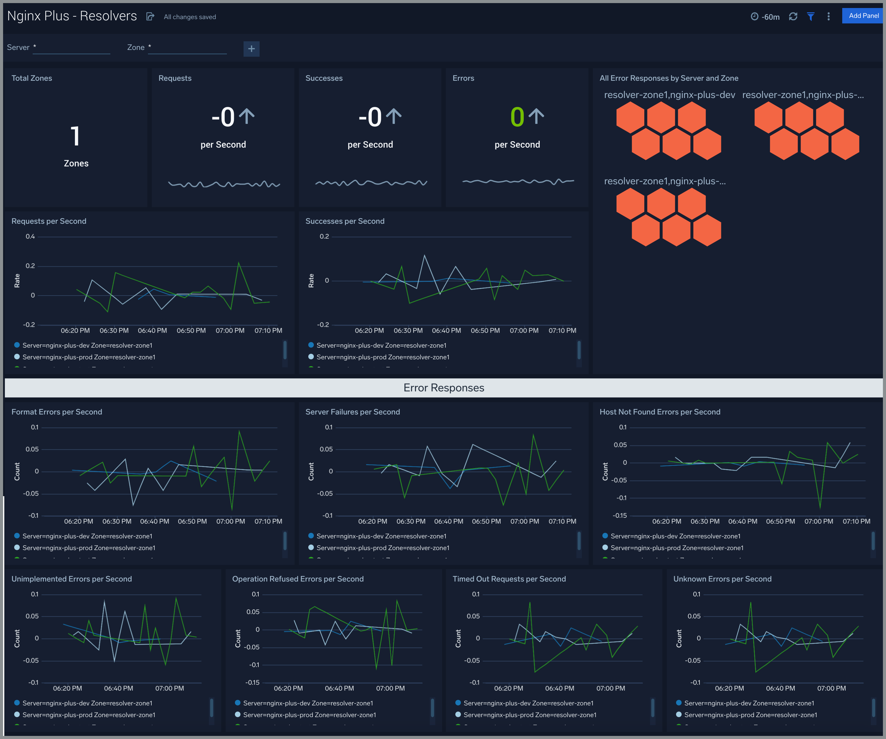 The Nginx Plus - Resolvers dashboard provides DNS server statistics of requests and responses per each DNS status zone.