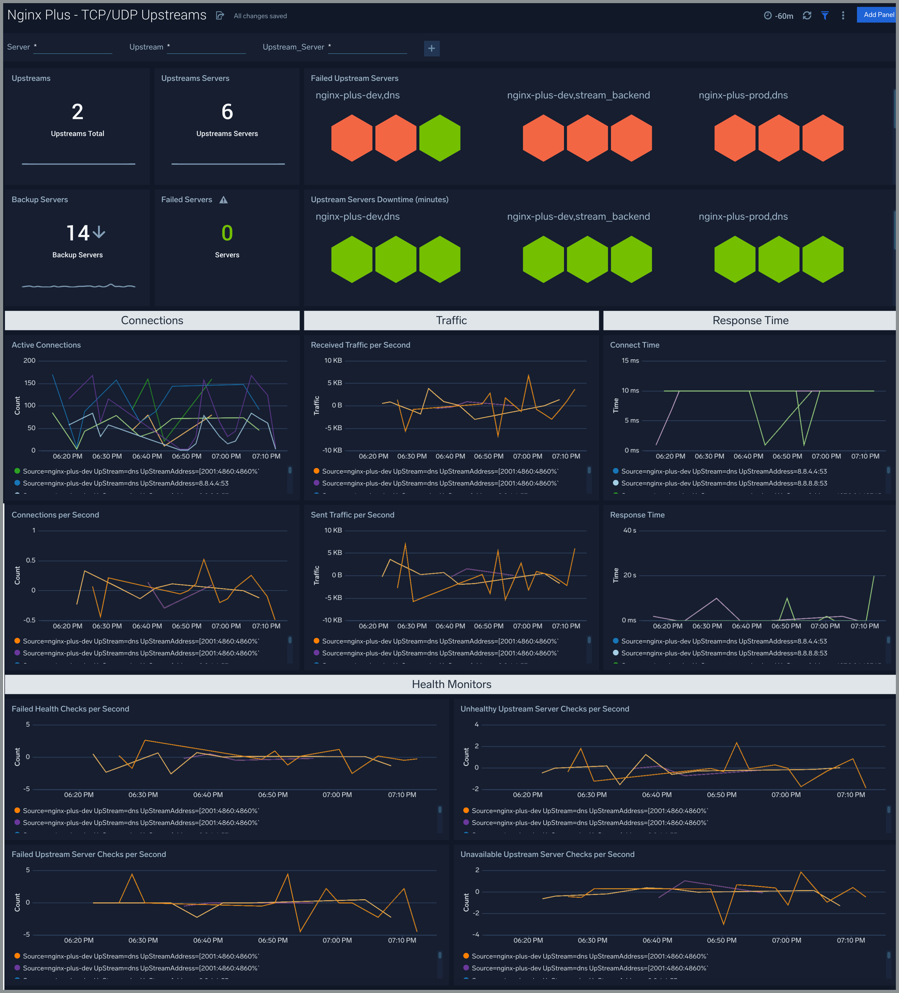 The Nginx Plus - TCP/UDP Upstreams dashboard provides information about each upstream group for TCP and UDP traffic, showing the number of TCP and UDP upstreams, servers, backup servers, error responses, and health monitoring.