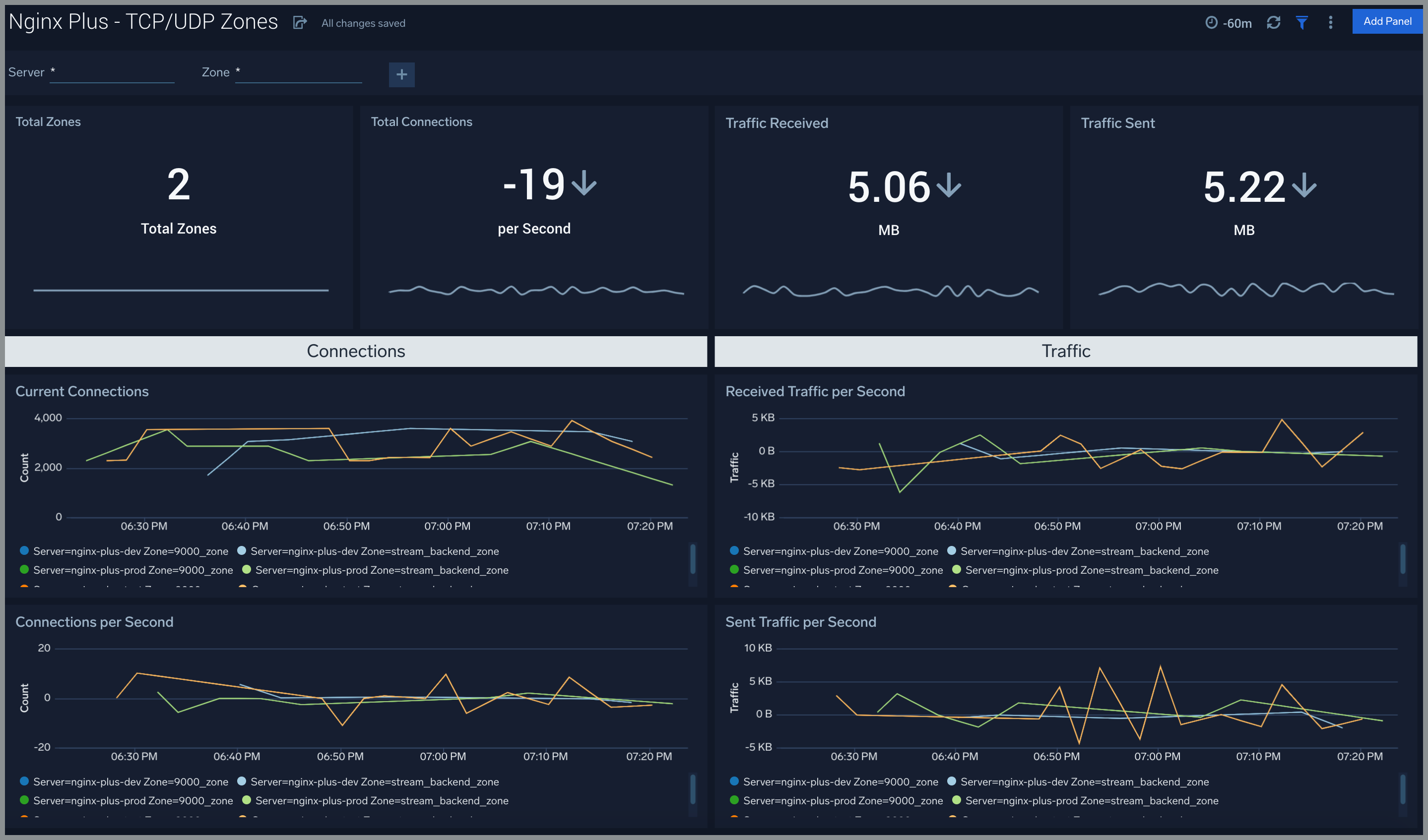 The Nginx Plus - TCP/UDP Zones dashboard provides TCP and UDP status zones with charts for connection limiting.
