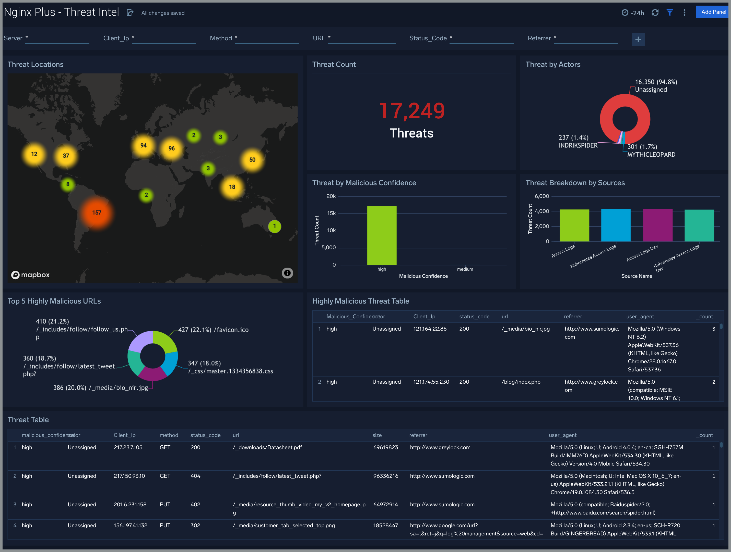 The Nginx Plus - Threat Intel dashboard provides an at-a-glance view of threats to Nginx servers on your network. Dashboard panels display the threat count over a selected time period, geographic locations where threats occurred, source breakdown, actors responsible for threats, severity, and a correlation of IP addresses, method, and status code of threats.