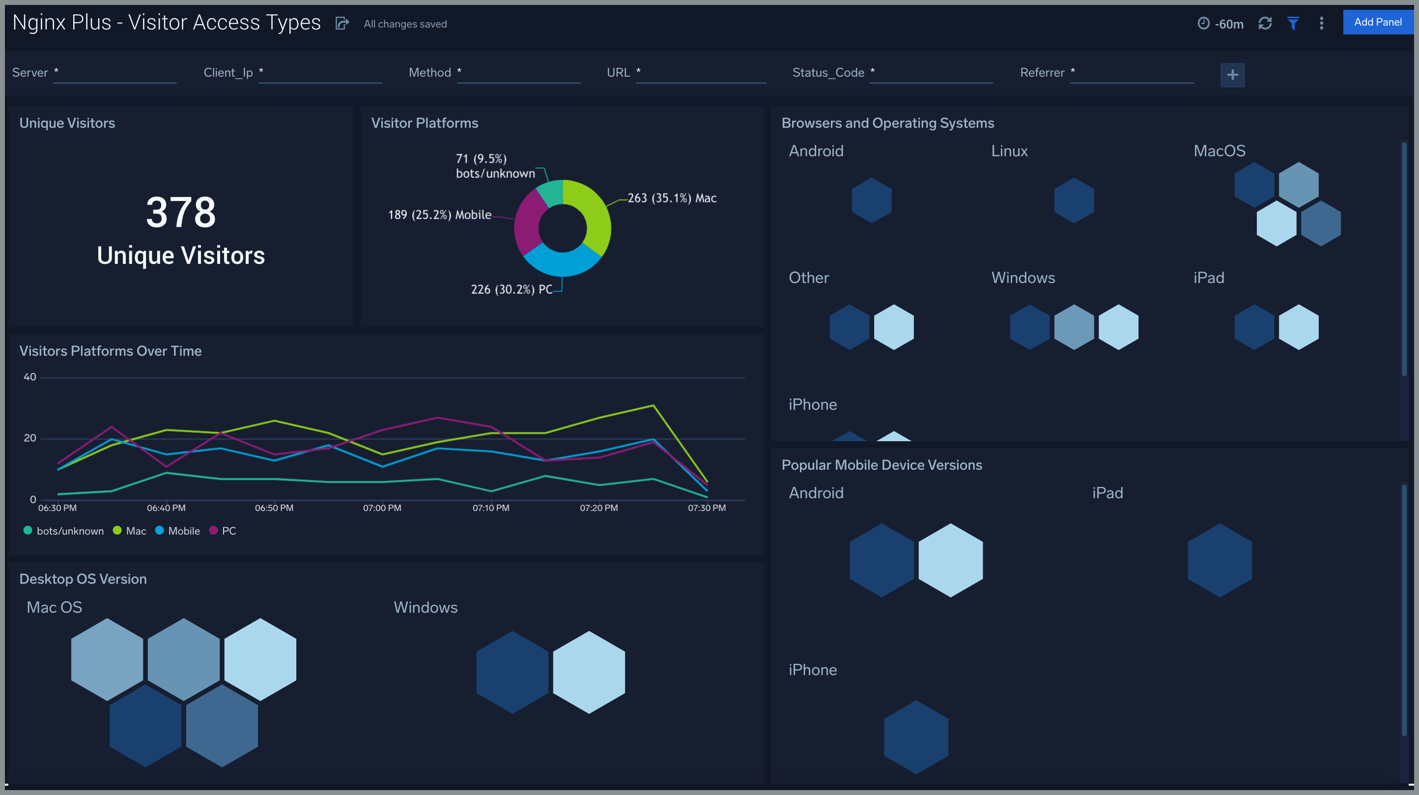 The Nginx Plus - Visitor Access Types dashboard provides insights into visitor platform types, browsers, and operating systems, as well as the most popular mobile devices, PC and Mac versions used.