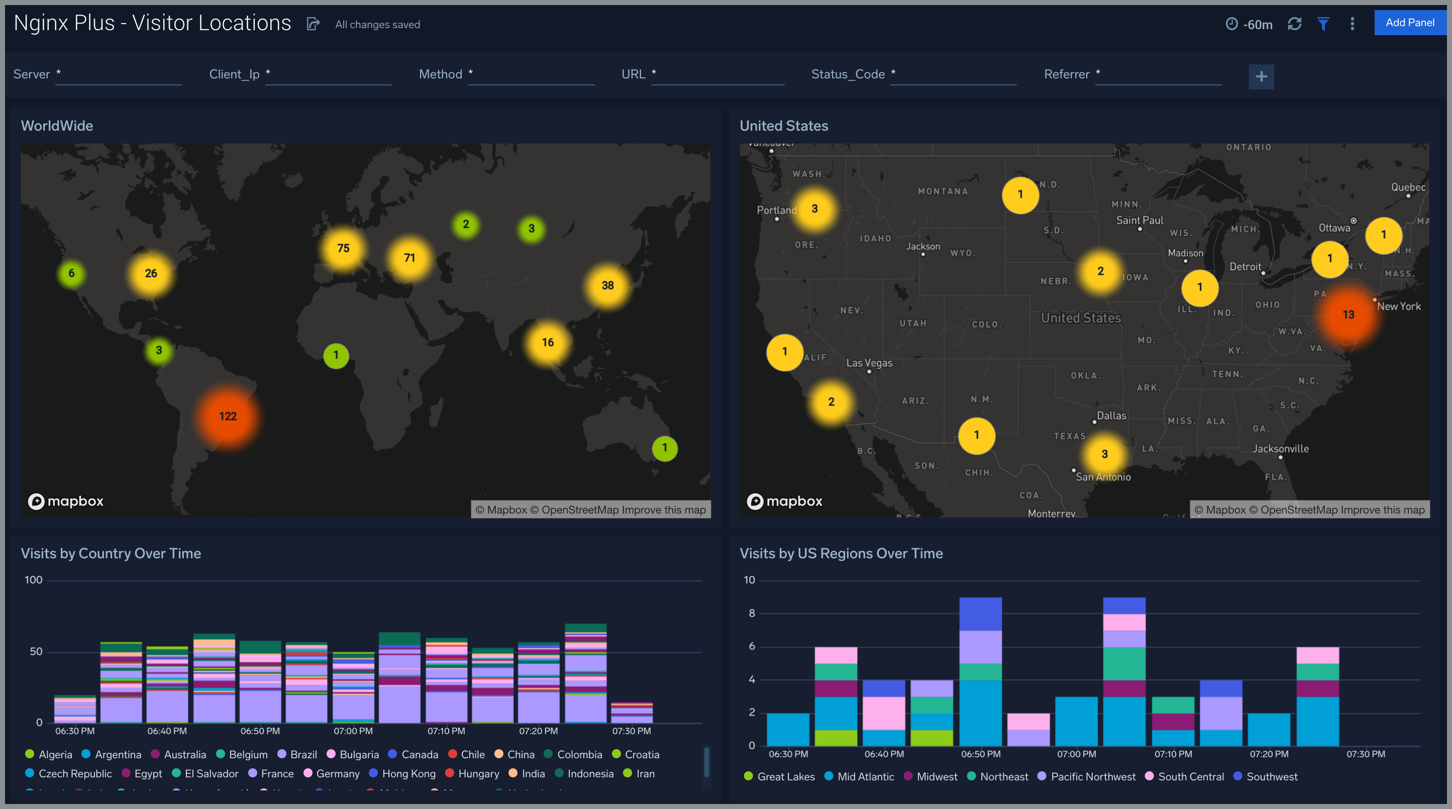 The Nginx Plus - Visitor Locations dashboard provides a high-level view of Nginx visitor geographic locations both worldwide and in the United States. Dashboard panels also show graphic trends for visits by country over time and visits by US region over time.