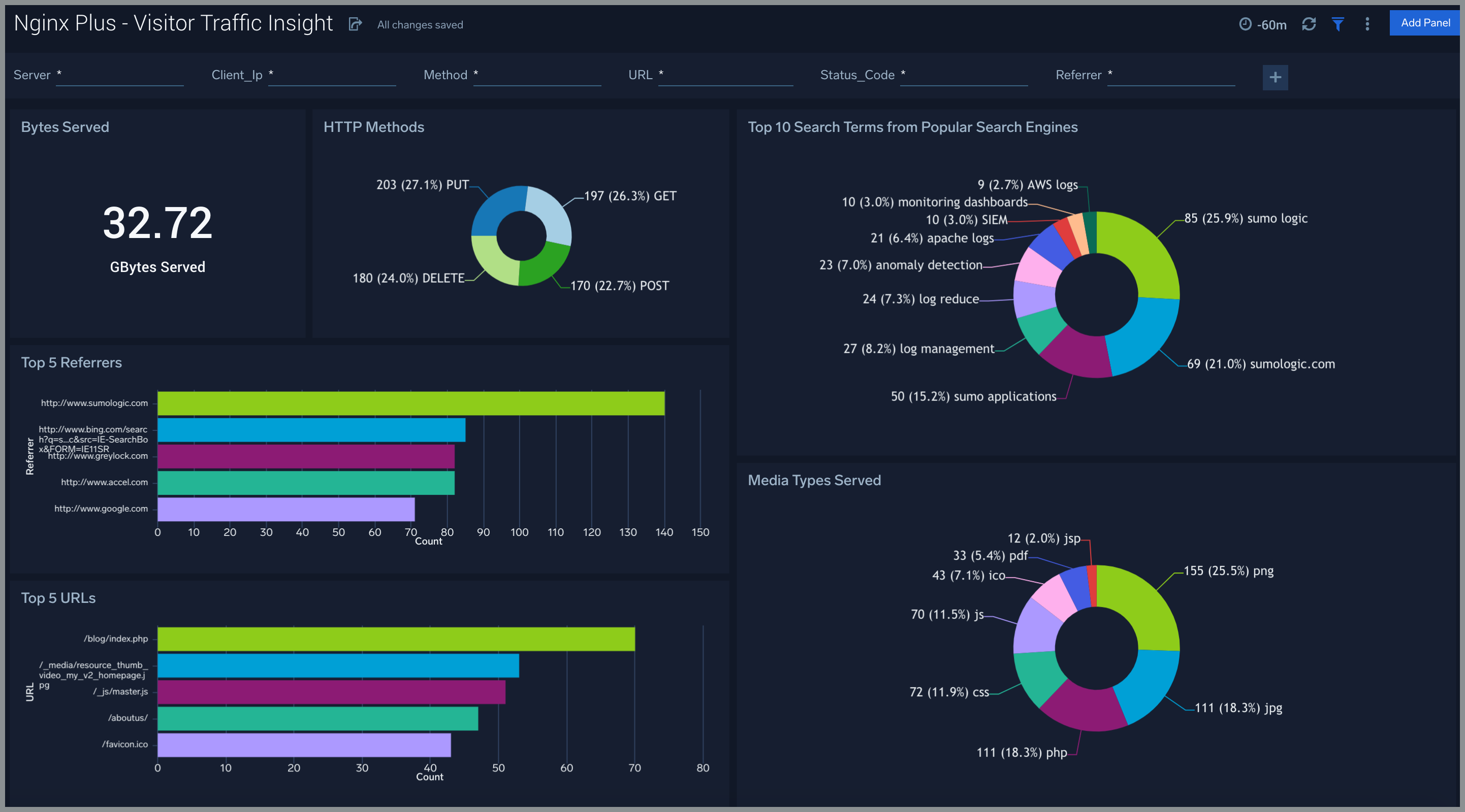 The Sumo Logic app for Nginx Plus supports logs as well as Metrics for Nginx Plus, which is a web server that can be used as a reverse proxy, load balancer, mail proxy, and HTTP cache.