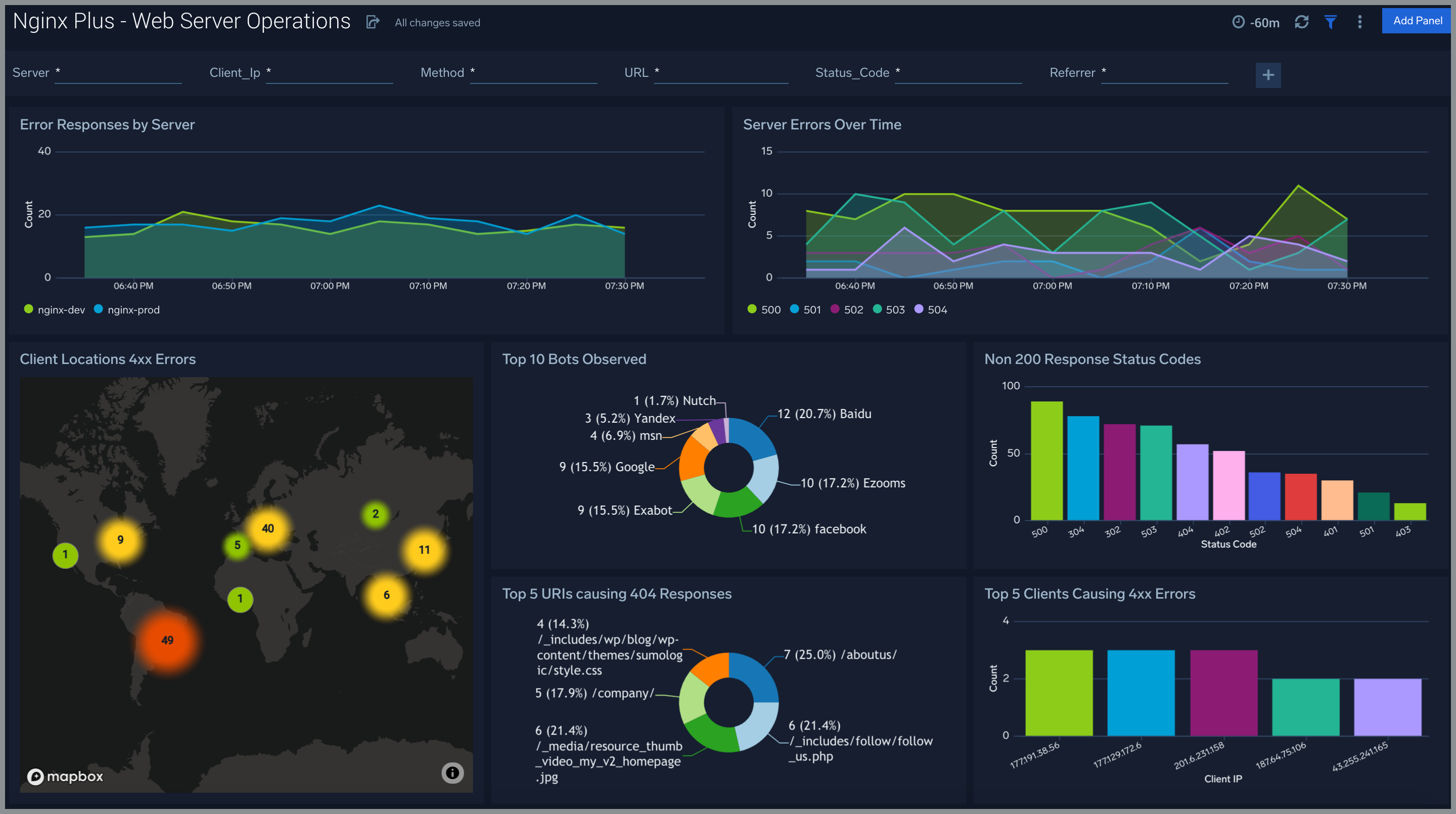 The Nginx Plus - Web Server Operations dashboard provides a high-level view combined with detailed information on the top ten bots, geographic locations, and data for clients with high error rates, server errors over time, and non 200 response code status codes. Dashboard panels also show information on server error logs, error log levels, error responses by a server, and the top URIs responsible for 404 responses.