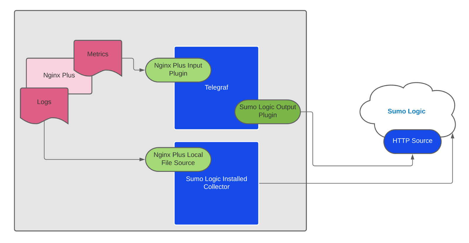 Telegraf runs on the same system as Nginx Plus and uses the Nginx Plus input plugin to obtain Nginx Plus metrics, and the Sumo Logic output plugin to send the metrics to Sumo Logic. Logs from Nginx on the other hand are sent to either a Sumo Logic Local File source.