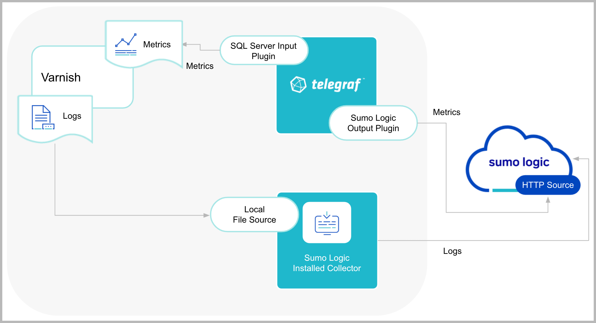 Telegraf runs on the same system as Varnish and uses the Varnish input plugin to obtain Varnish metrics, and the Sumo Logic output plugin to send the metrics to Sumo Logic. Logs from Varnish, on the other hand, are sent to a Sumo Logic Local File source.