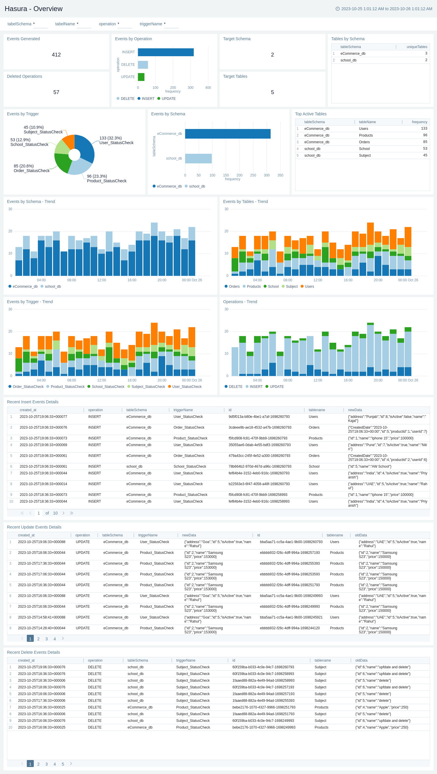 The Hasura - Overview dashboard offers a comprehensive snapshot of data events and schema operations, providing valuable insights for effective management. It tracks the volume of Events Generated and their distribution by Operation, including Deleted events. It provides visibility into the Target Schema and Tables and analyzes data events by Table Schema and Trigger. The dashboard also highlights events by specific tables, enabling a deep dive into data trends. With trend analysis for Table Schema, Events by Table, Trigger, and Operation, users can make informed decisions about data architecture and operations. Additionally, it keeps users up to date with concise summaries of Recent Insertions, Updates, and Deletions, ensuring a real-time understanding of the data ecosystem.