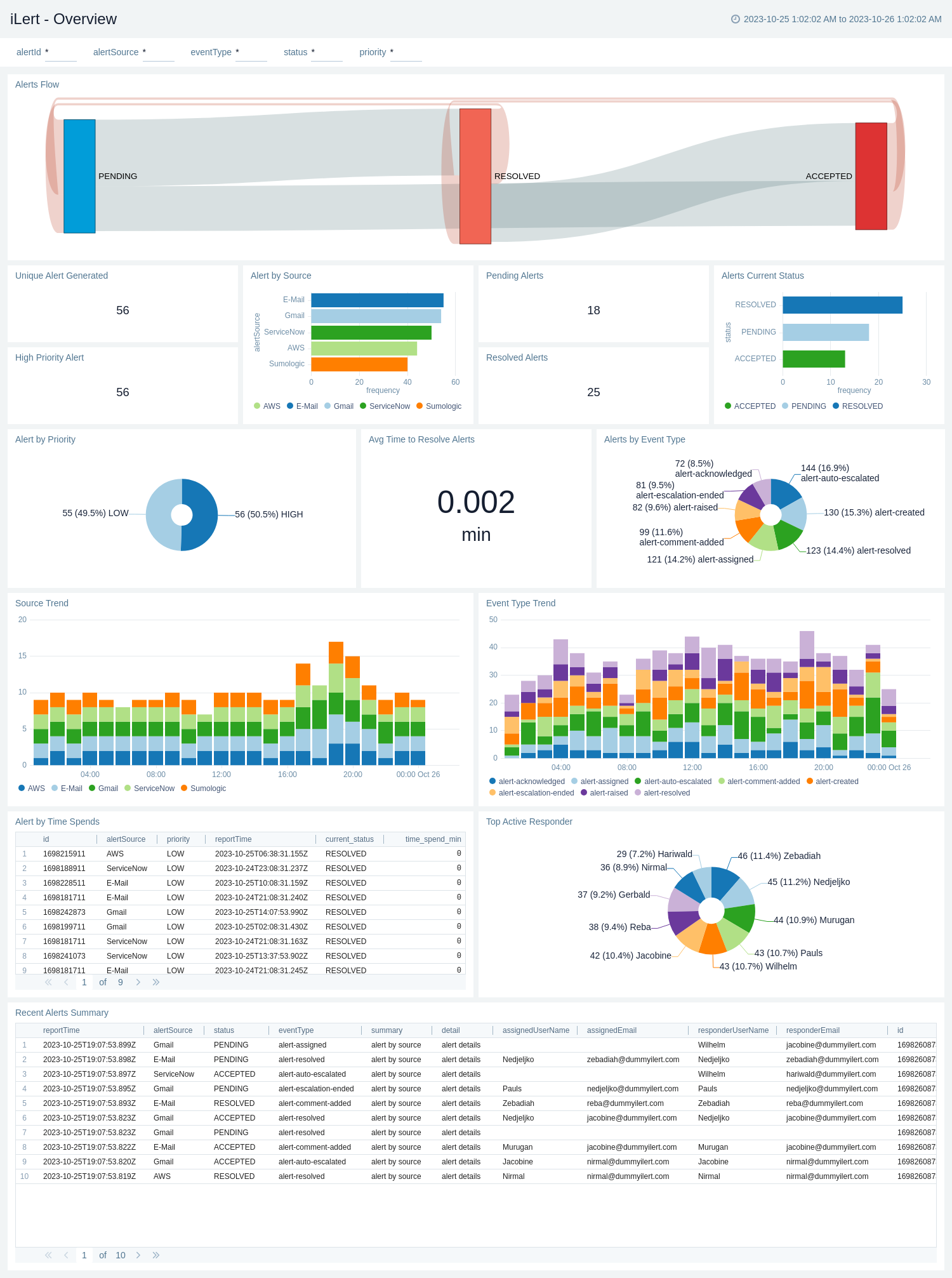 The iLert - Overview dashboard presents a comprehensive insight into the alert management system, featuring a range of informative panels. Starting with Unique Alert Generation statistics, it displays alerts categorized by their sources and highlights High-Priority alerts for immediate attention. The dashboard also tracks Pending and Resolved Alerts, providing a real-time overview of the alert status. Additionally, it offers a breakdown of alerts by priority, identifies the Top Active Responders, and analyses alert data based on event types and source trends. Users can efficiently spot event-type trends and review a concise summary of recent alerts.