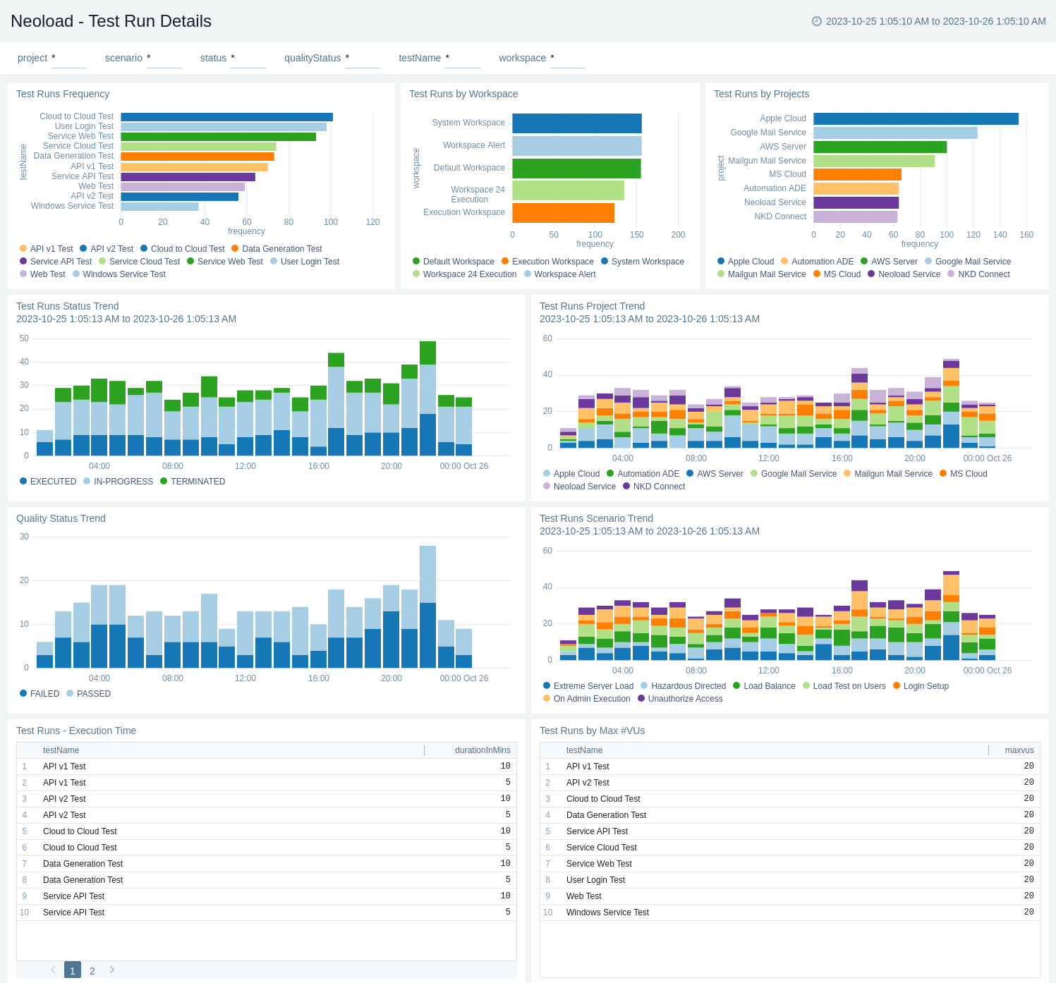 The Neoload - Test Run Details dashboard offers a comprehensive overview of performance testing initiatives, providing insights through multiple panels. It allows tracking Test Frequency, categorizing tests by Workspace and Projects, and monitoring trends in Status, Project-wise test trends, Quality status trends, and Test Scenario trends. Additionally, it provides visibility into tests correlated with Execution Time and Max#VUs, enabling in-depth analysis of test performance and informed decision-making for optimizing the testing strategy.