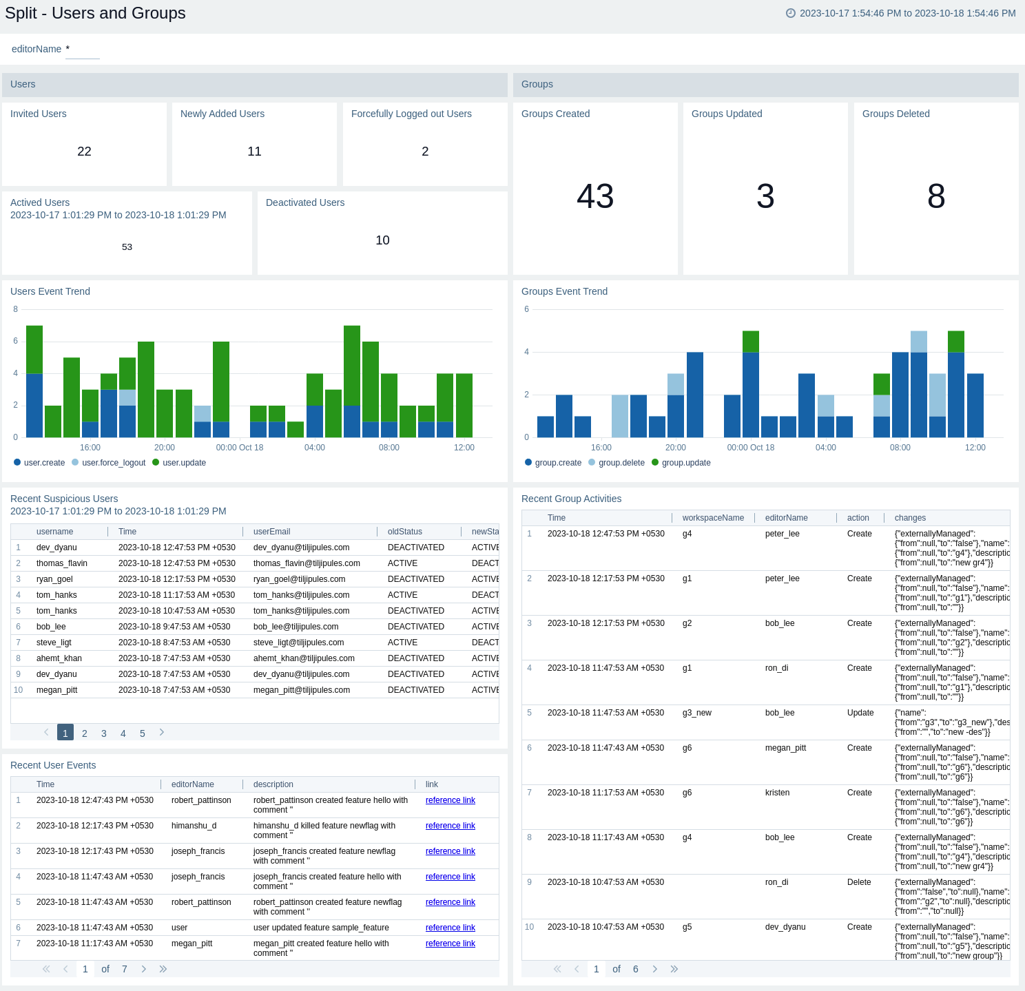 The Split - Users and Groups dashboard offers concise statistical summaries pertaining to Split users and groups, including administrative actions taken concerning them.