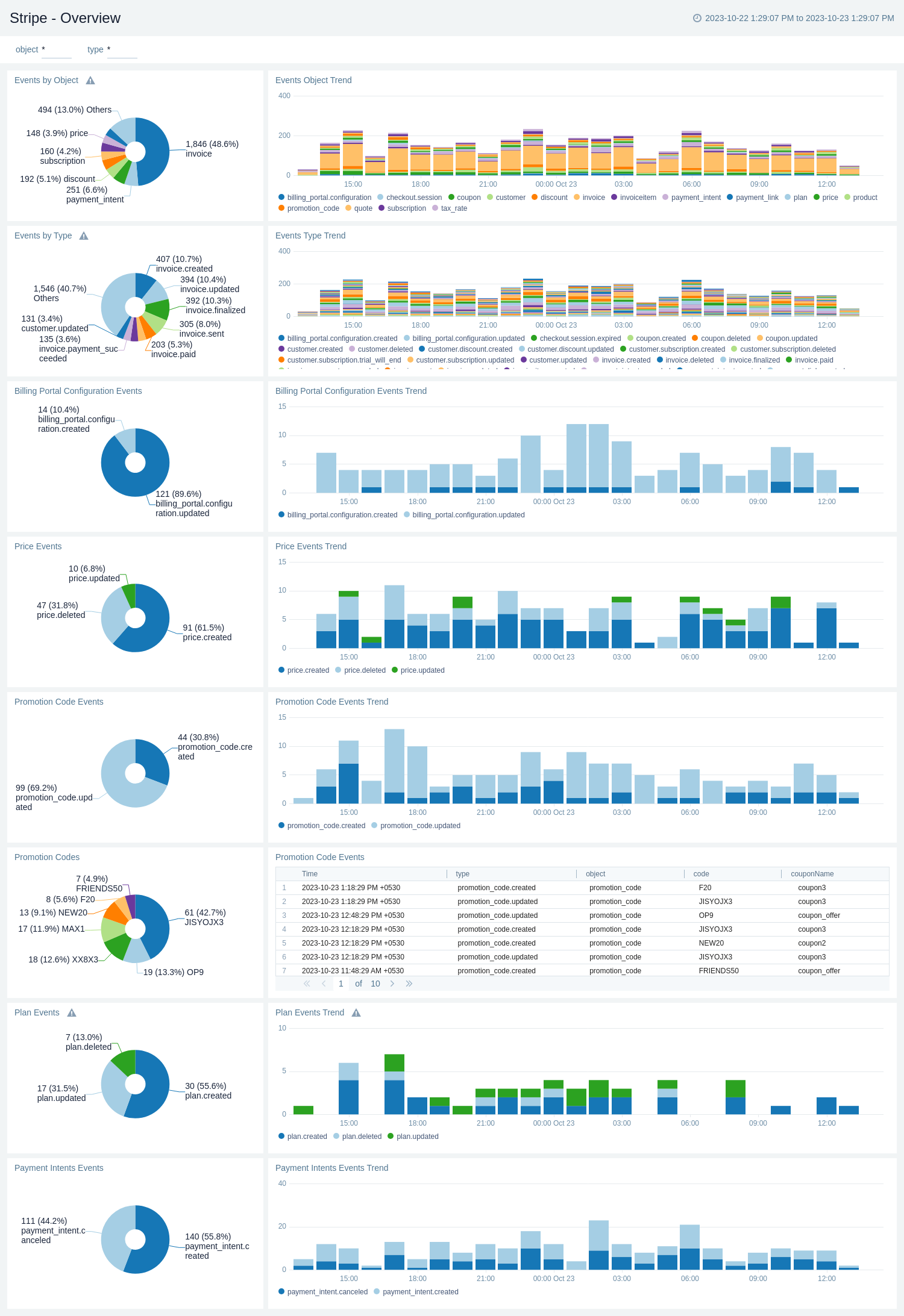 The Stripe - Overview enhances transparency into activities within the Stripe platform by classifying them based on event type and object. It offers valuable insights and statistics on events related to Payment Intents, Plans, Promotional Codes, and Billing Portal Configuration.
