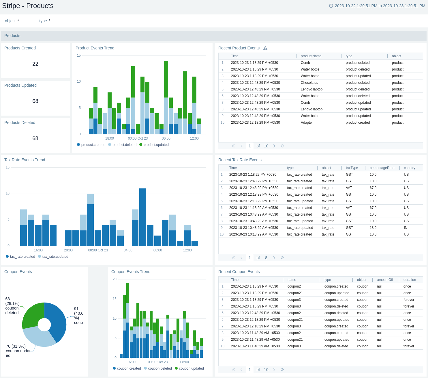 The Stripe - Products provides valuable insights and statistics concerning events related to products, encompassing tax rates and coupons.