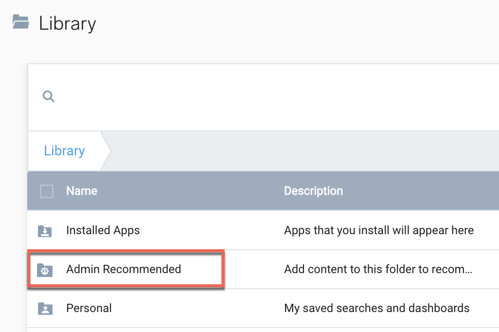 Important content can be dashboards that help new users get started, or common searches that your organization needs often. You can draw attention to this content by putting it into Admin Recommended, which appears at the top of the Library in the Left-Nav.