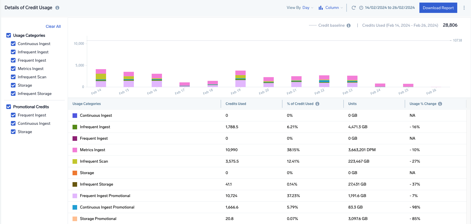 - Total Credits Usage Breakdown. Consumed contract and promotional credits.