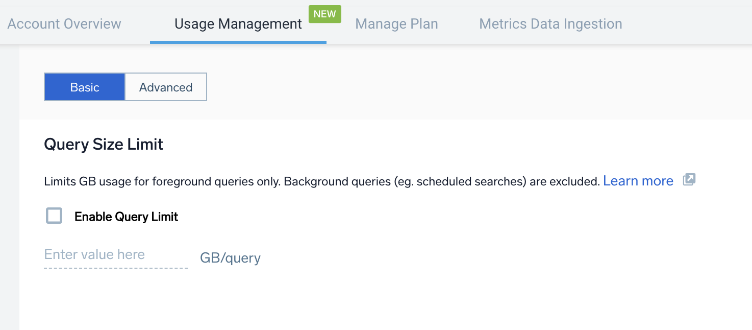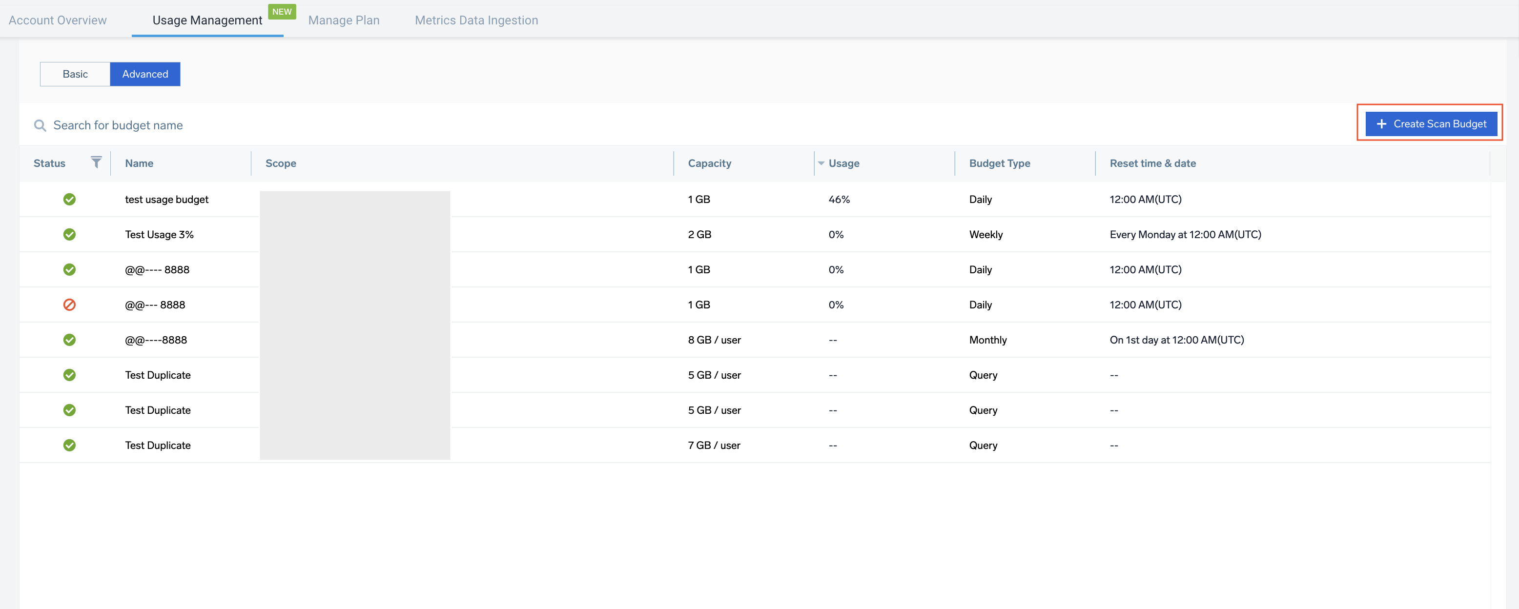 Classic UI. In the main Sumo Logic menu, select Administration > Account > Usage Management. - Navigate to Advanced tab and click on + Create Scan Budget.