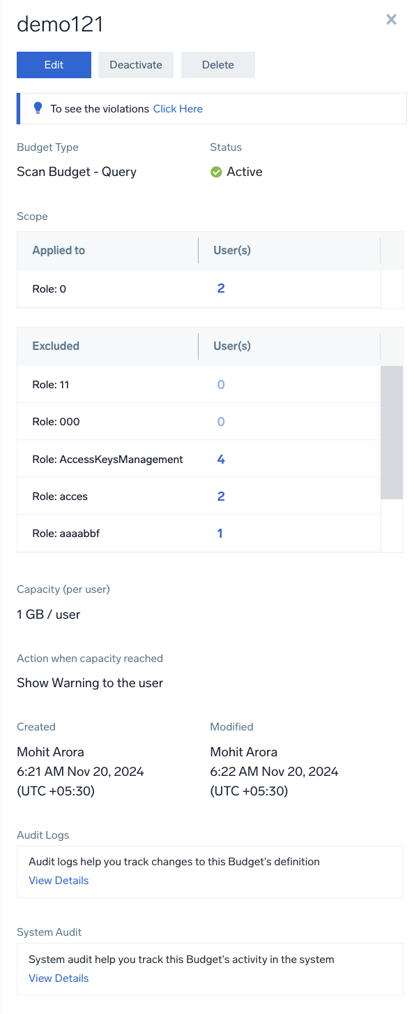 - Scope. Displays the list of roles or users for whom the selected scan budget is applied for or excluded from.
