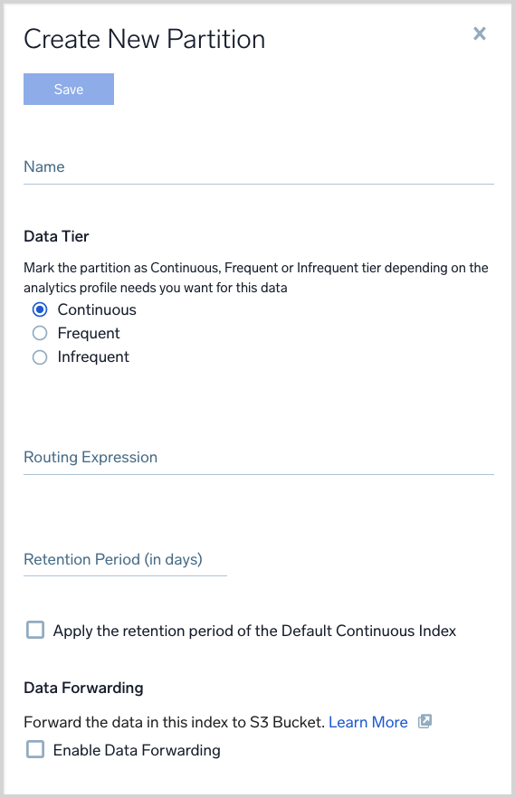 When you create a partition, you specify the Data Tier where the partition will reside, a routing expression that determines what data is stored in the partition, and a retention period. Optionally, you can enable data forwarding of the partition’s data to an S3 bucket.