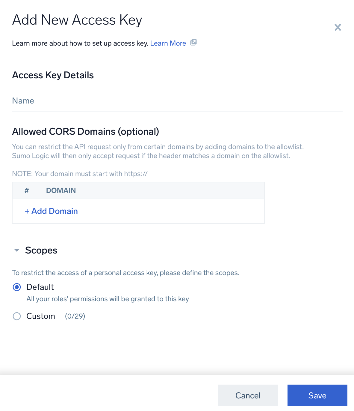 - Allowed CORS Domains (optional). Create an allowlist of domains from which the access key can be used to access Sumo Logic APIs. For more information, see CORS support.