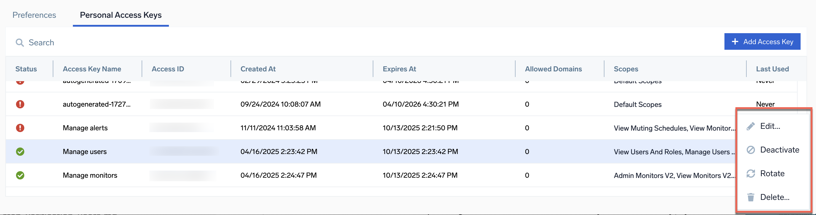 If you have the Manage Access Keys role capability, you can edit, deactivate, and delete any access keys created by other users in your organization.
