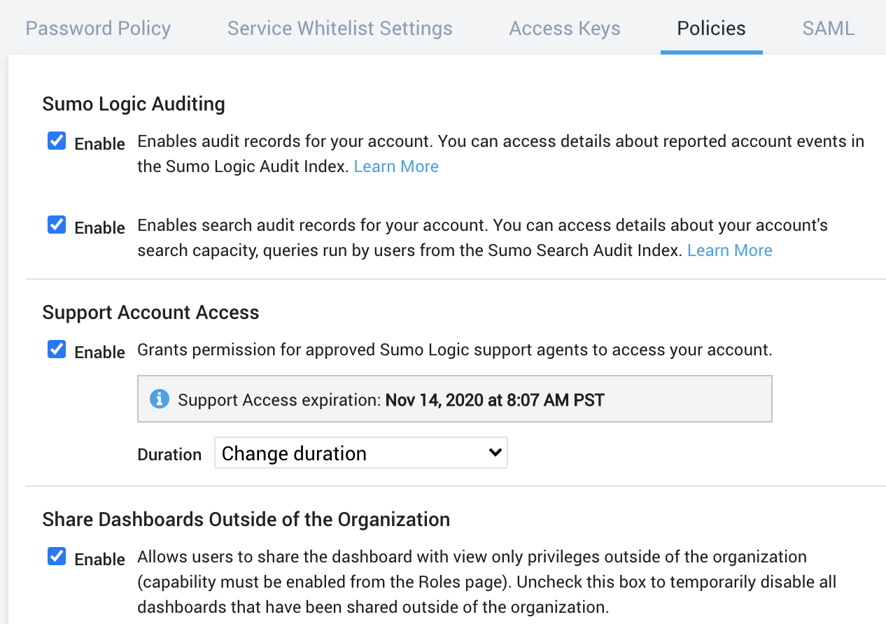 Classic UI. In the main Sumo Logic menu, select Administration > Security > Policies. - Next to Support Account Access, select the Enable check box.