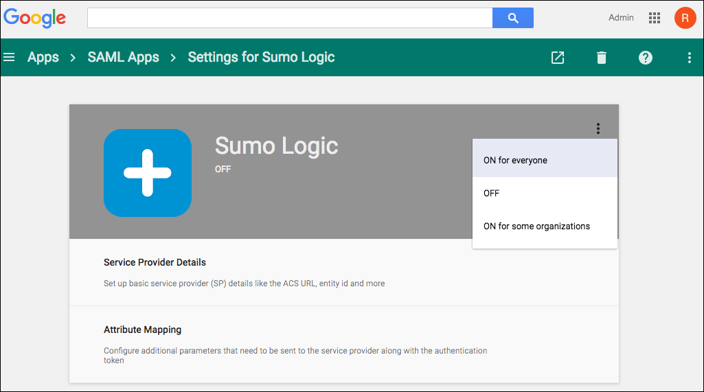 - After a short delay, the new Sumo Logic SAML App will be displayed in your Google Apps login menu. In some cases, it may take up to 10 minutes for the new app to appear.