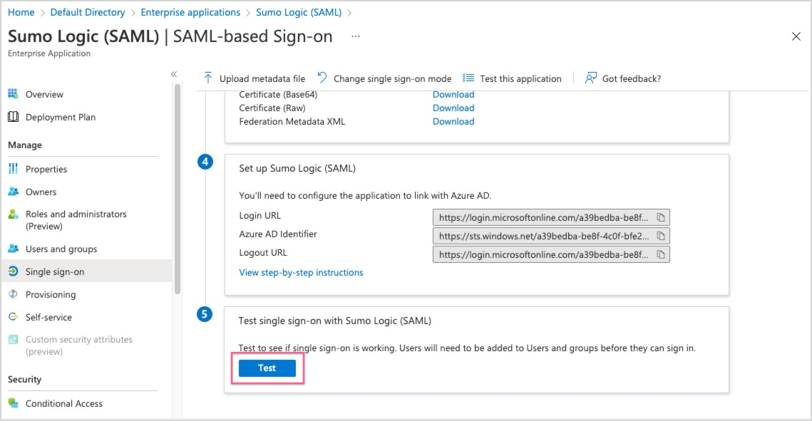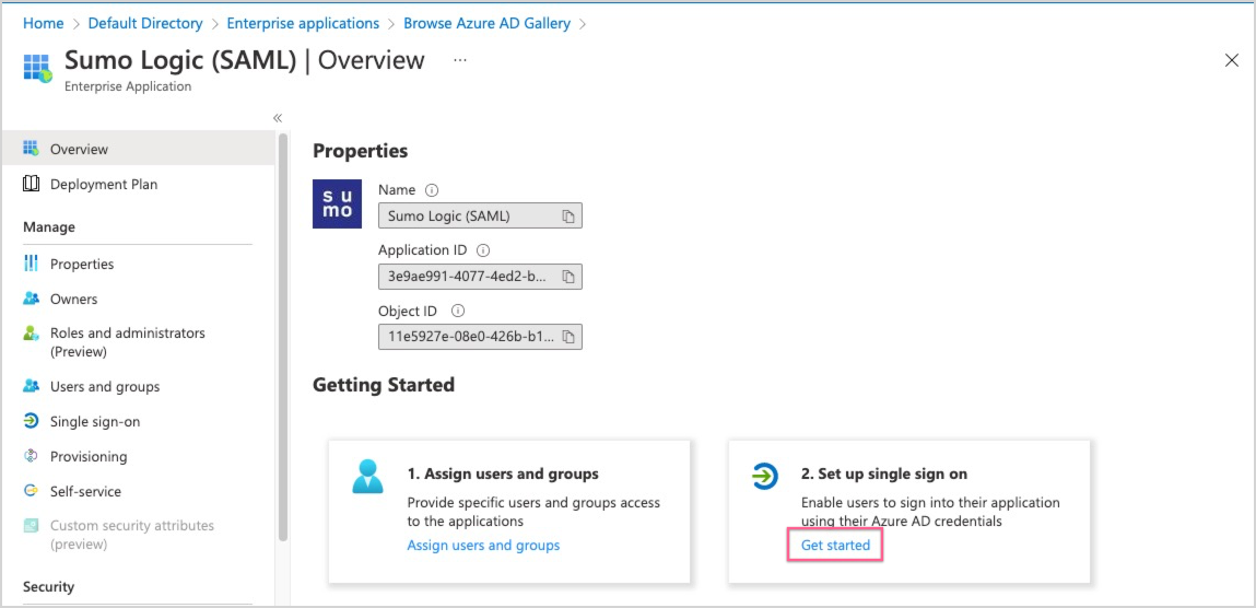 - Select the Single Sign On menu item of your Sumo Logic application in Azure AD.