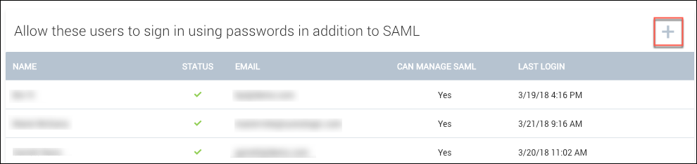 Having only one user able to bypass SAML may not be convenient or practical if you have a global company or a large team. You can add additional allowlisted users by clicking the (+) icon next to Allow these users to sign in using passwords in addition to SAML: