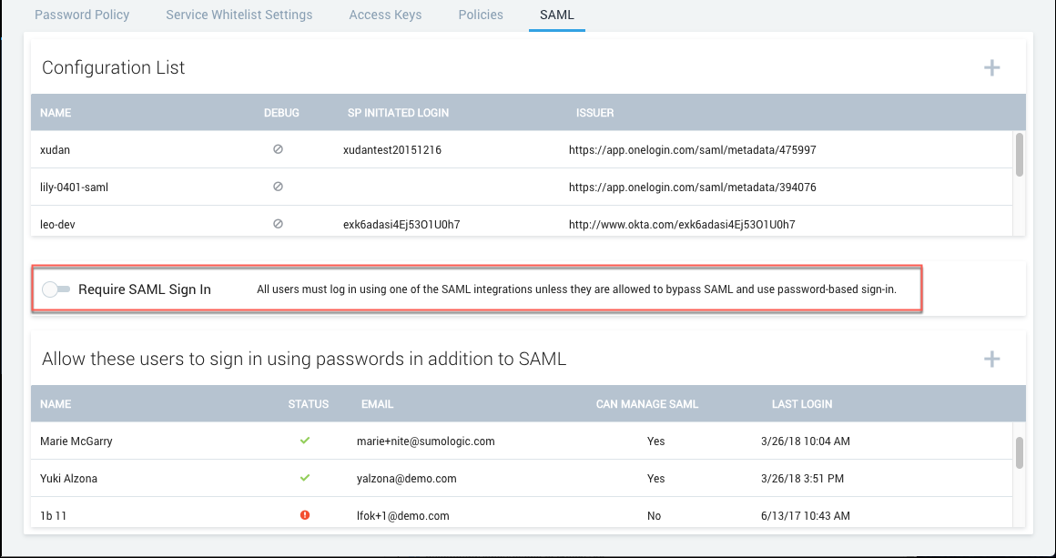 Sumo automatically adds your account under Allow these users to sign in using passwords in addition to SAML as an allowlisted user as a preventative measure to ensure you’re still able to access Sumo if you run into issues.
