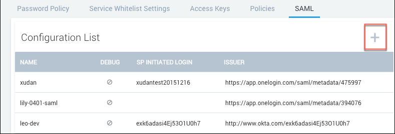 You can create multiple SAML configurations in Sumo. To create an additional SAML configuration, click the plus (+) icon to create a new configuration. Enter the settings for the new configuration, as described the previous section.