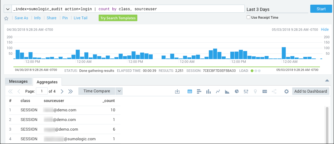 This query depends upon data in the Sumo audit index. If the audit index is not enabled, the query will not return results. To enable the index, follow the instructions in Enable and Manage the Audit Index.