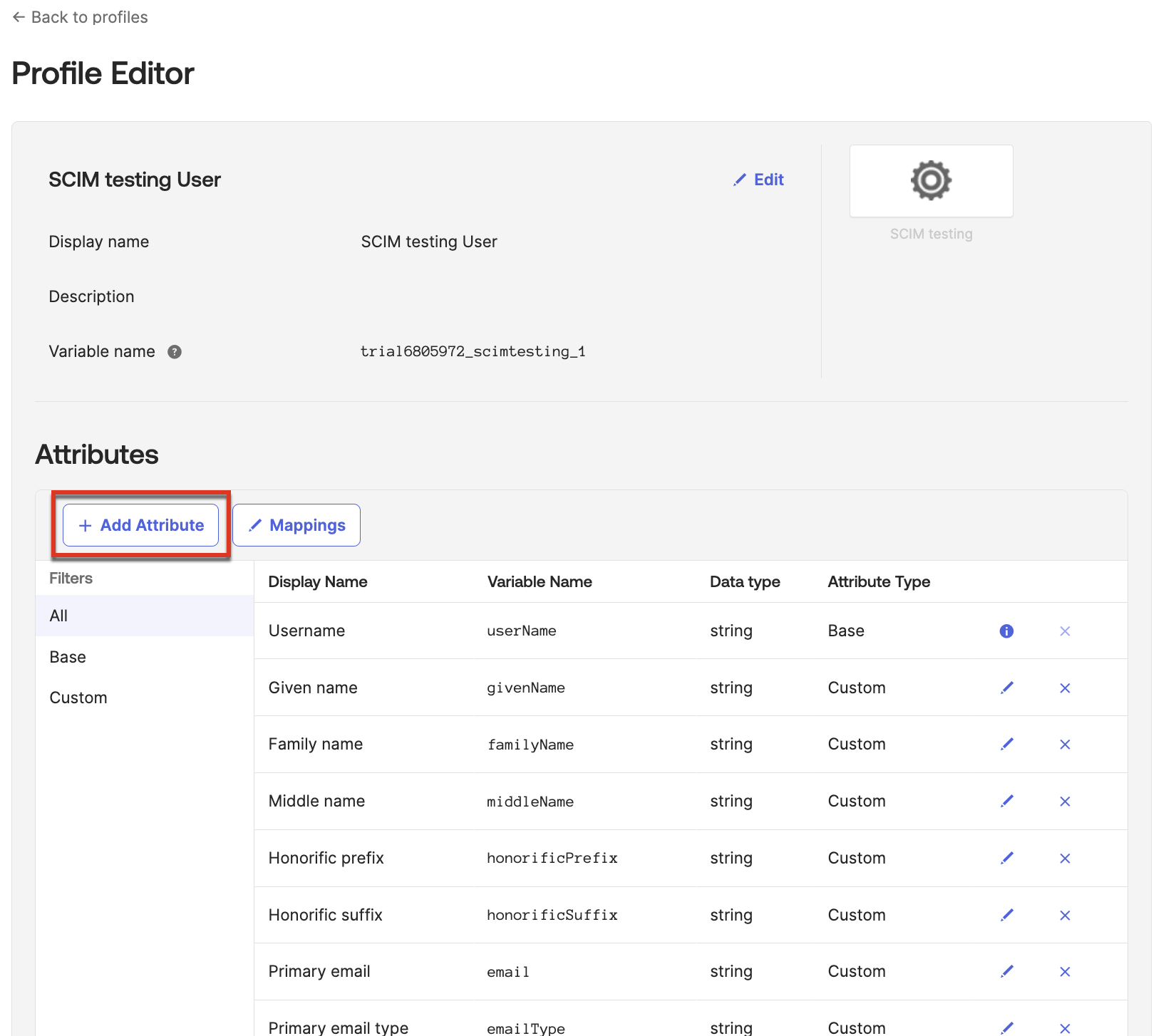 - SCIM connector base URL. Enter the API endpoint for your deployment for the SCIM User Management APIs using the format